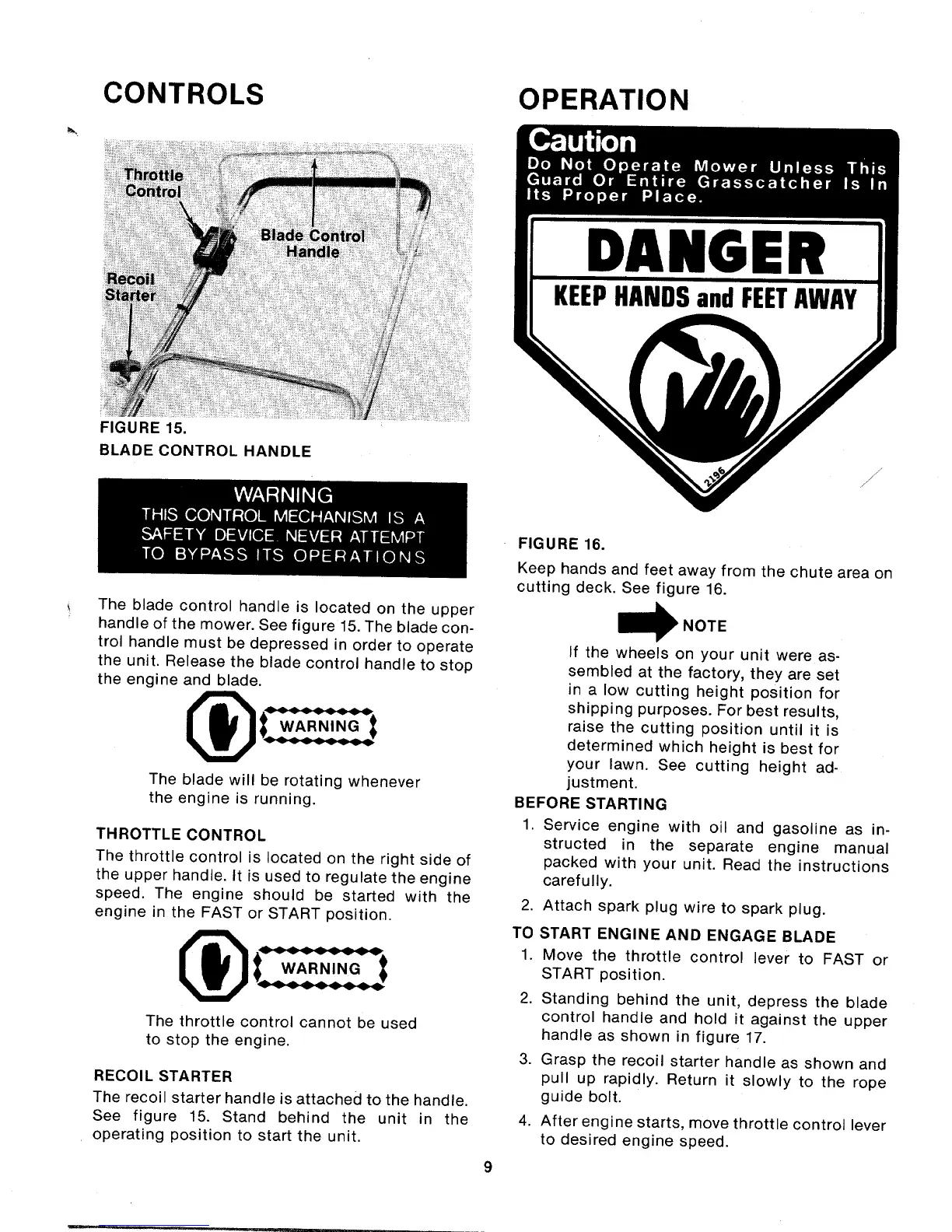MTD 115-062-352 - Controls Overview; Blade Control Handle Operation; Throttle and Recoil Starter; Operating the Mower