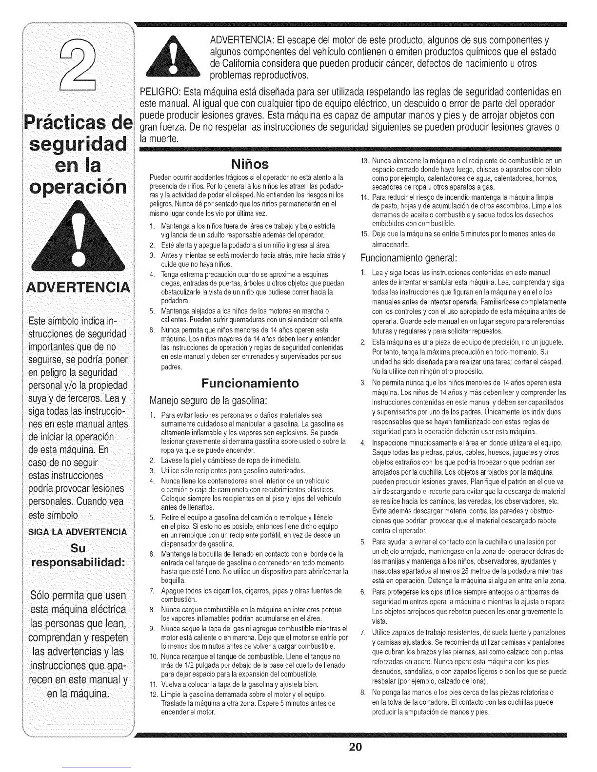 ADVERTENCIA: El escape del motor de este producto, algunos de sus componentes y