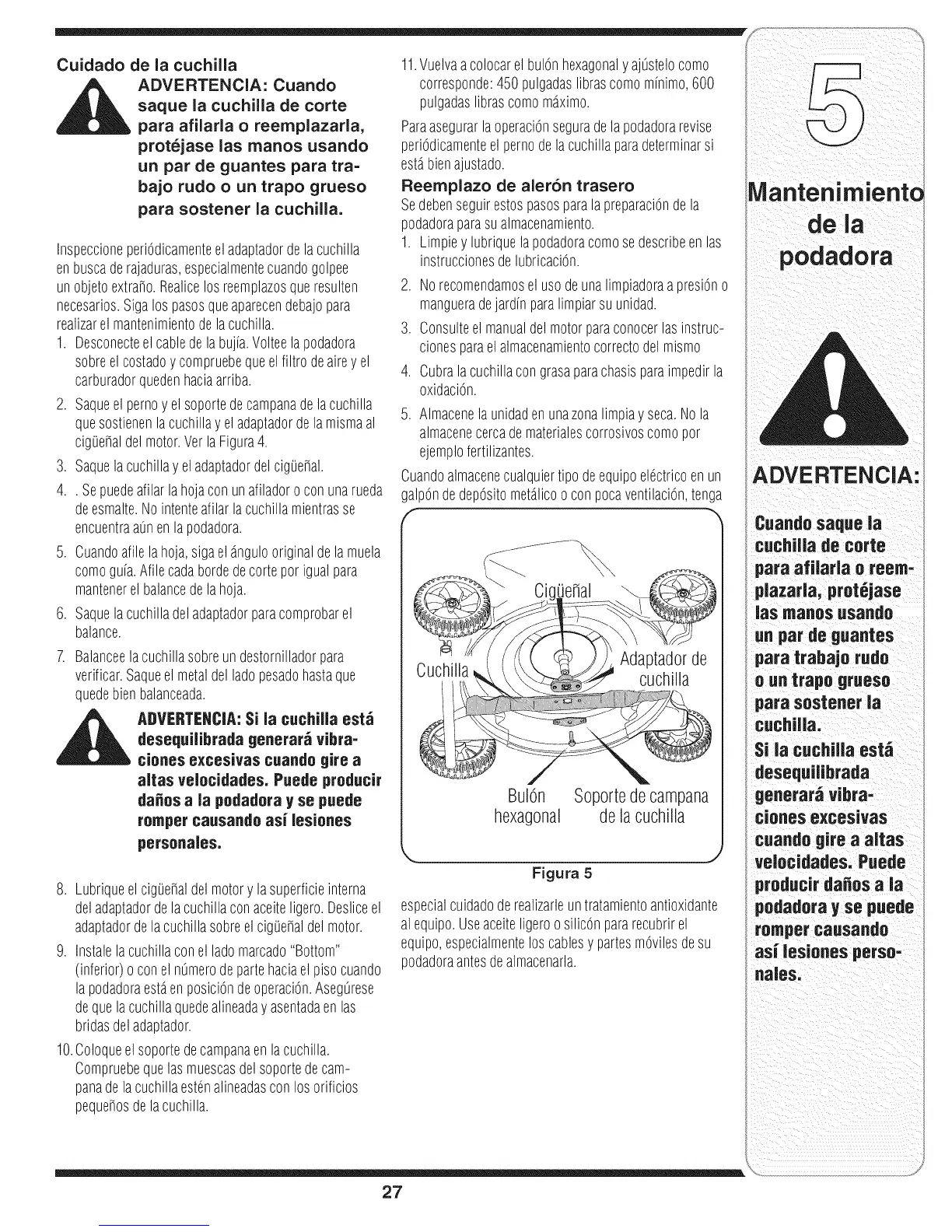 Cuidado de la cuchilla 11.Vuelvaa colocarel bul0nhexagonaly aj0stelocomo