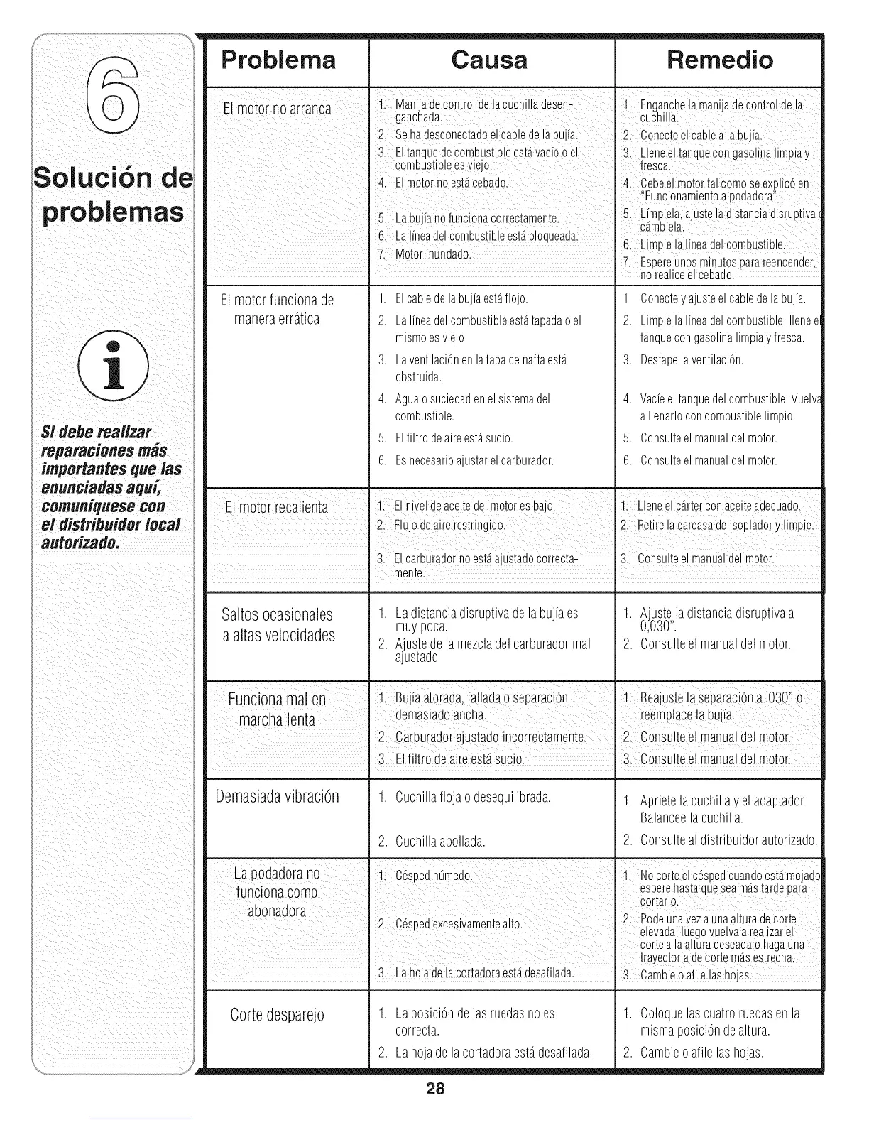 6. Esnecesarioajustarelcarburador. 6. Consulteel manualdelmotor.