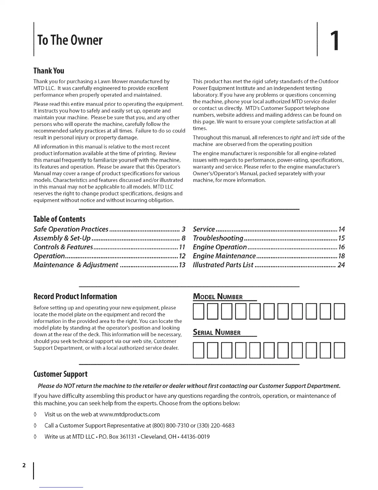 or contact us directly. MTD's Customer Support telephone