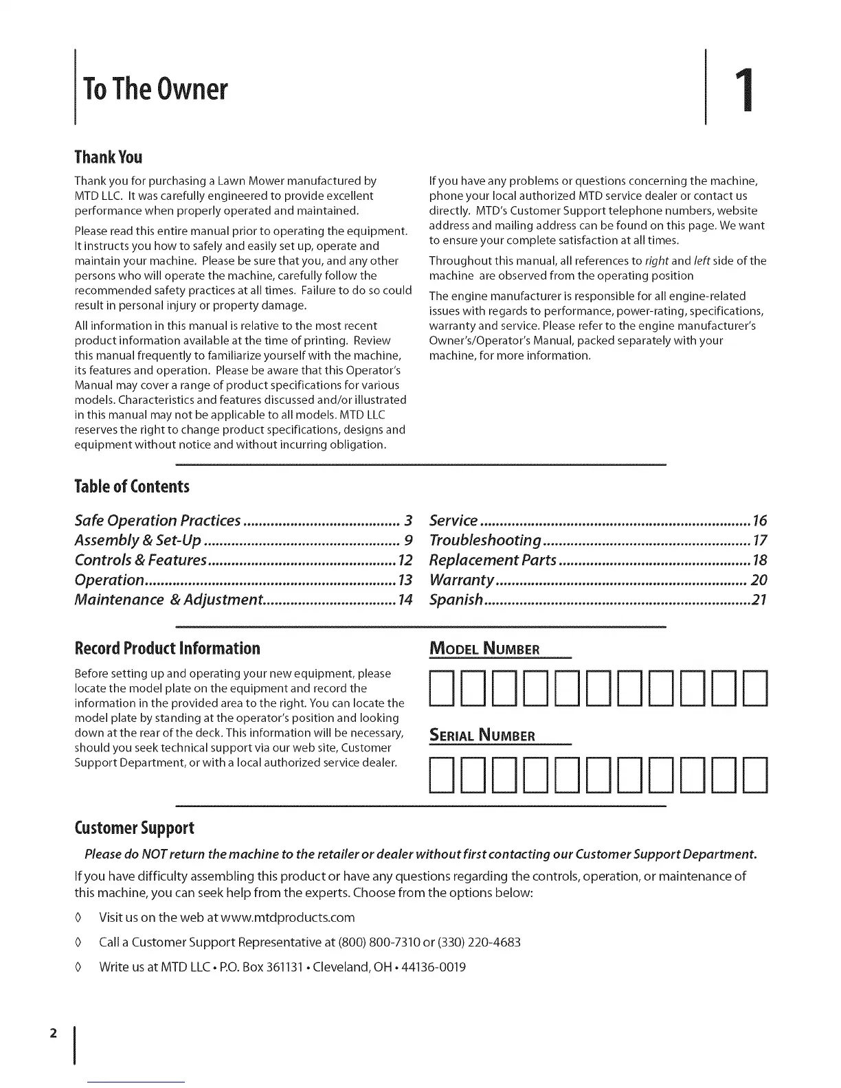 directly. MTD's Customer Support telephone numbers, website