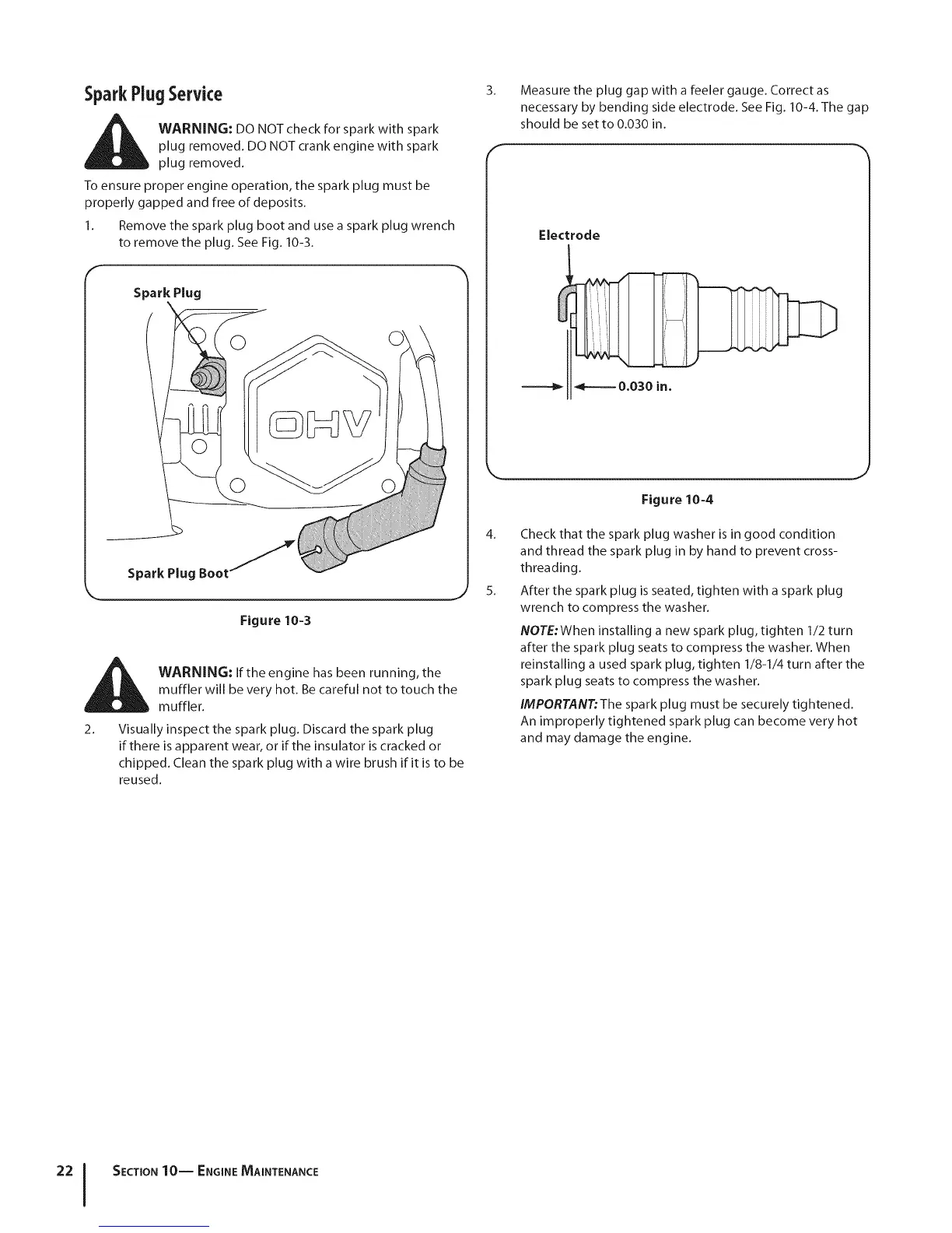 reinstalling a used spark plug, tighten 1/8-1/4 turn after the