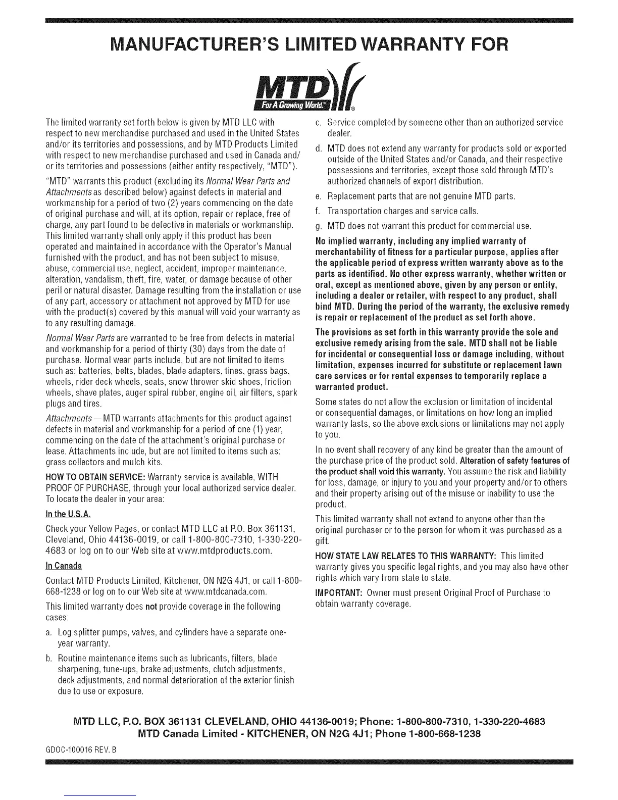 MTD LLC, P.O. BOX 361131 CLEVELAND, OHIO 44136=0019; Phone: 1=800=800=7310, 1=330=220=4683