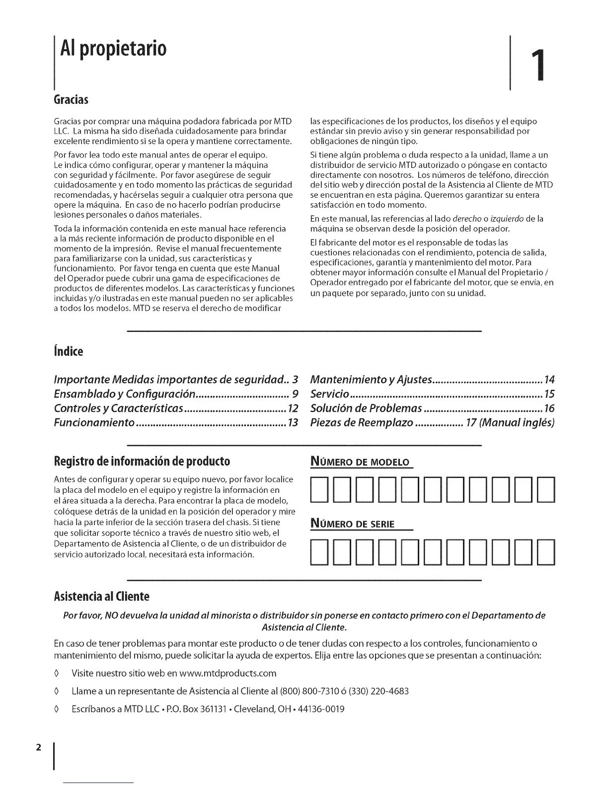 del sitio web y direcci6n postal de la Asistencia al Cliente de MTD