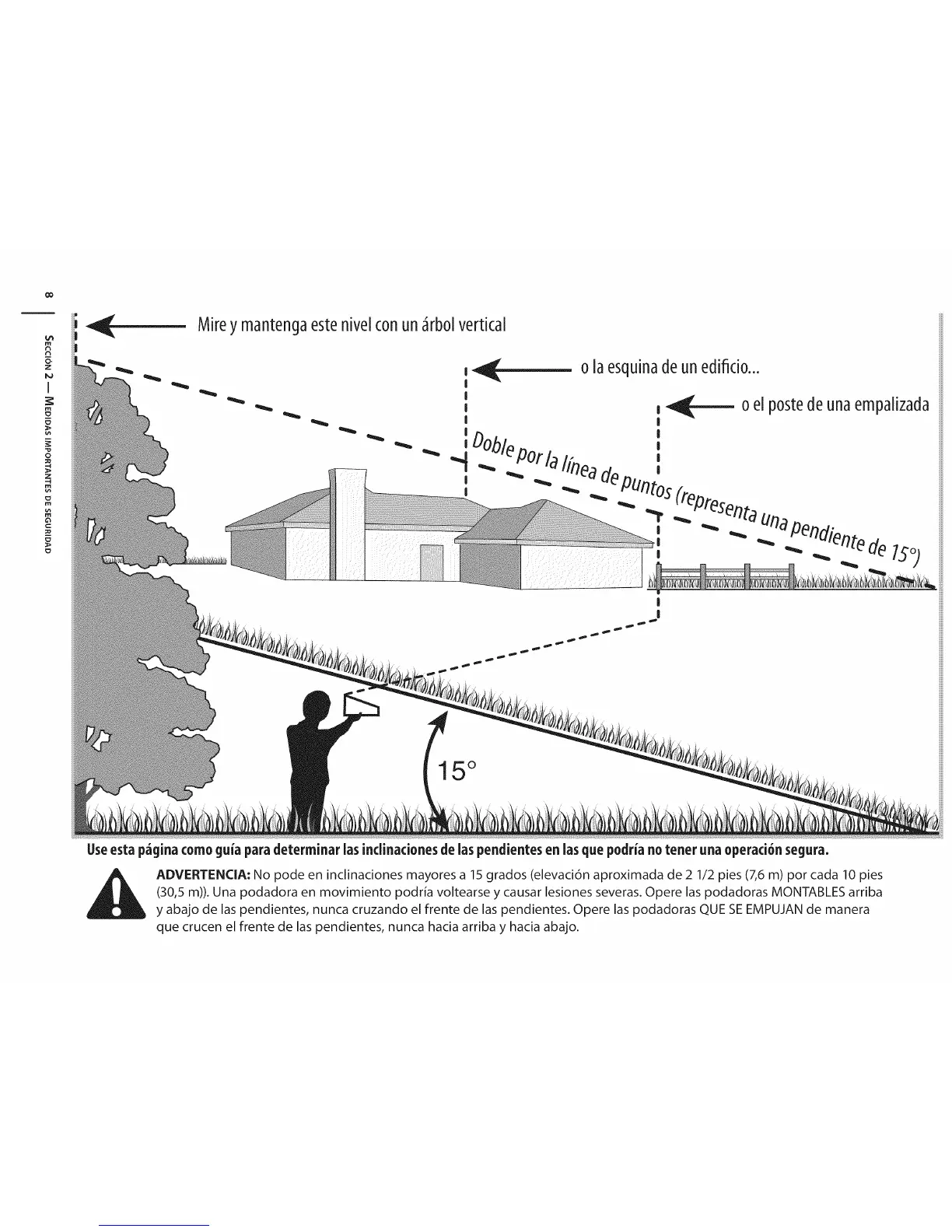 ADVERTENCIA: No pode en inclinaciones mayores a 15 grados (elevaci6n aproximada de 2 1/2 pies (7,6 m) por cada 10 pies