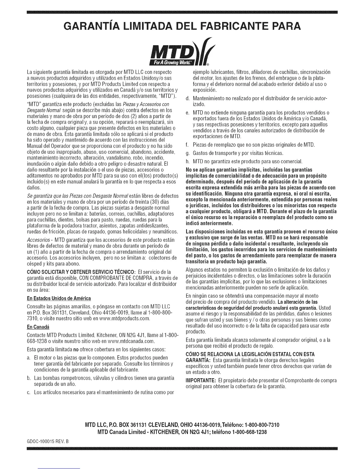 "MTD" garantiza esteproducto (excluidas las PiezasyAccesorioscon