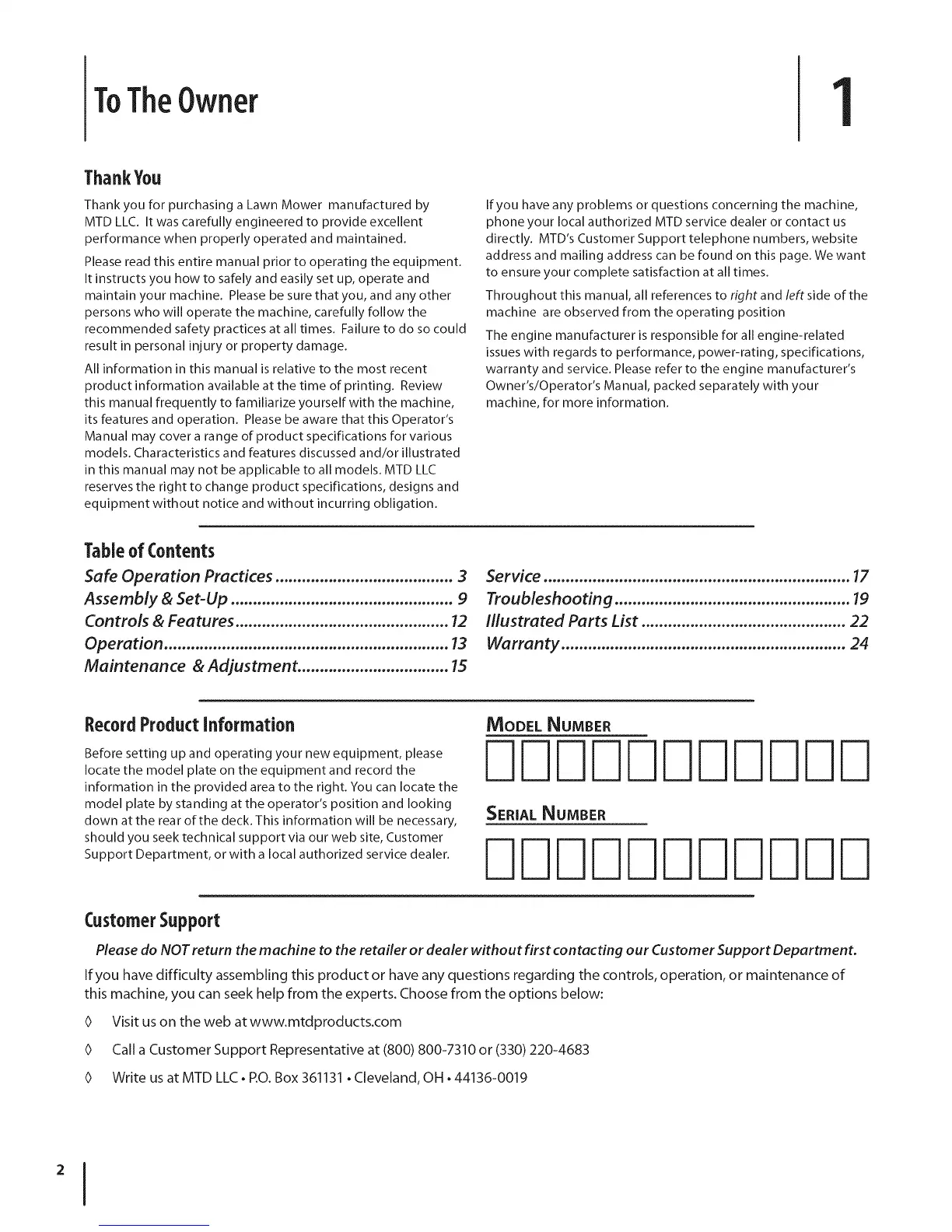 directly. MTD's Customer Support telephone numbers, website