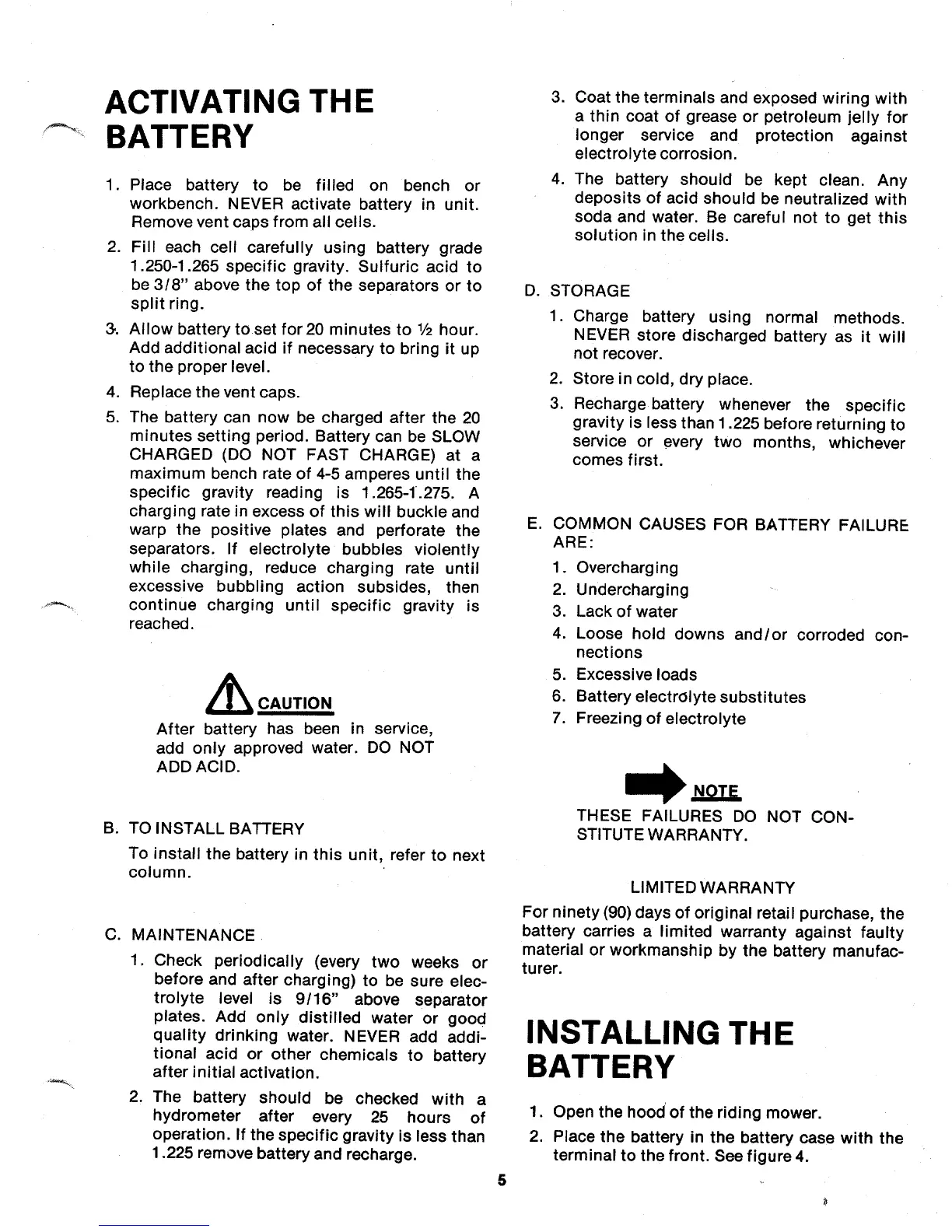 MTD 136-480A - ACTIVATING THE BATTERY; MAINTENANCE; INSTALLING THE BATTERY