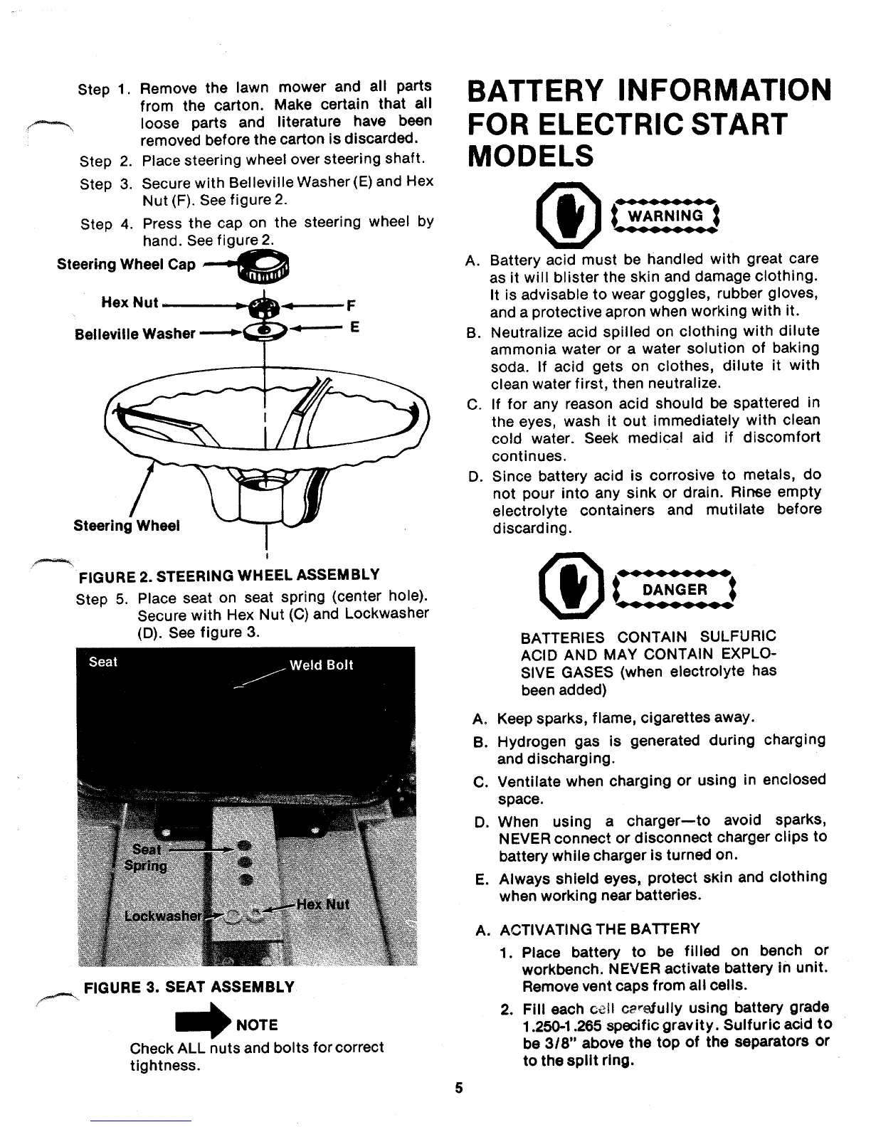 MTD 139-498A - Battery Information for Electric Start Models; Steering Wheel Assembly; Seat Assembly; Activating the Battery