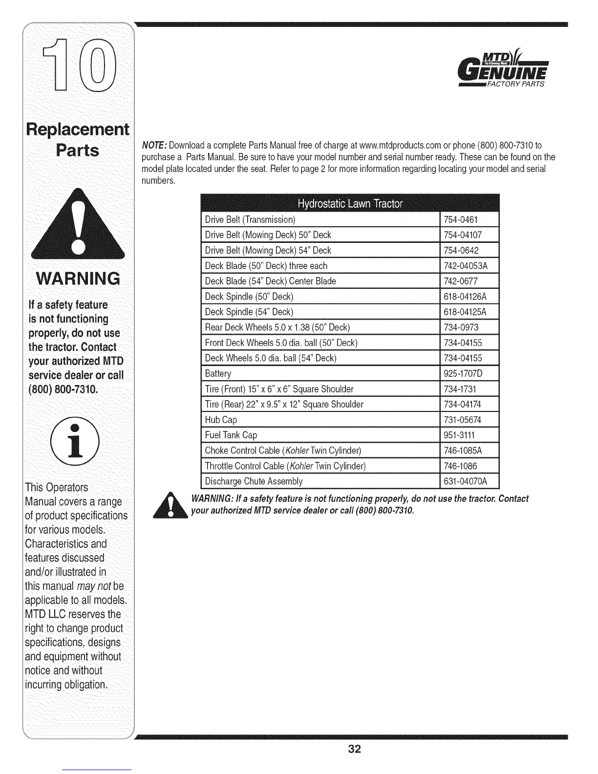 NOTE:Downloada completePartsManualfreeof chargeat www.mtdproducts.comor phone(800)800-7310to