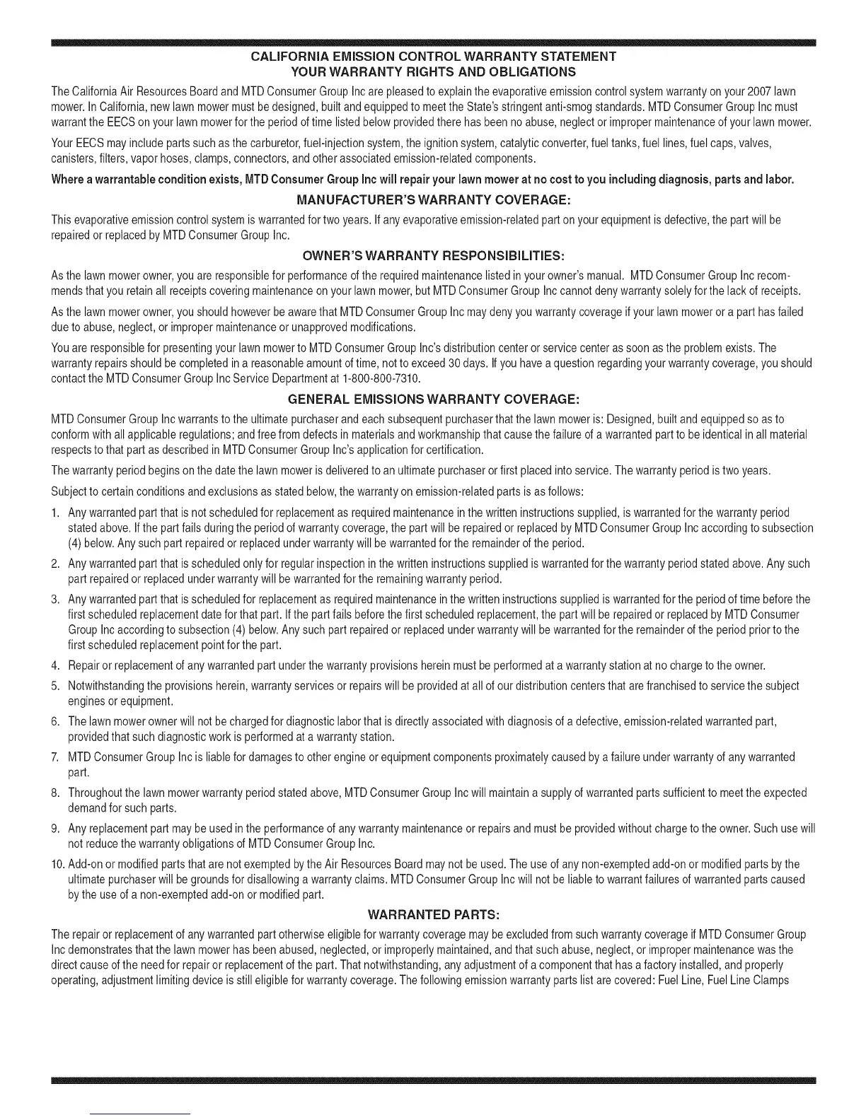 TheCaliforniaAir ResourcesBoardandMTDConsumerGroupInc are pleasedto explaintheevaporativeemissioncontrolsystemwarrantyonyour 2007lawn