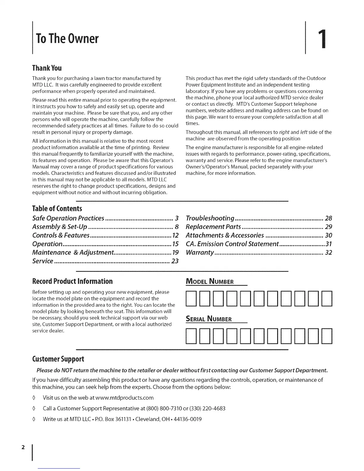 or contact us directly. MTD's Customer Support telephone