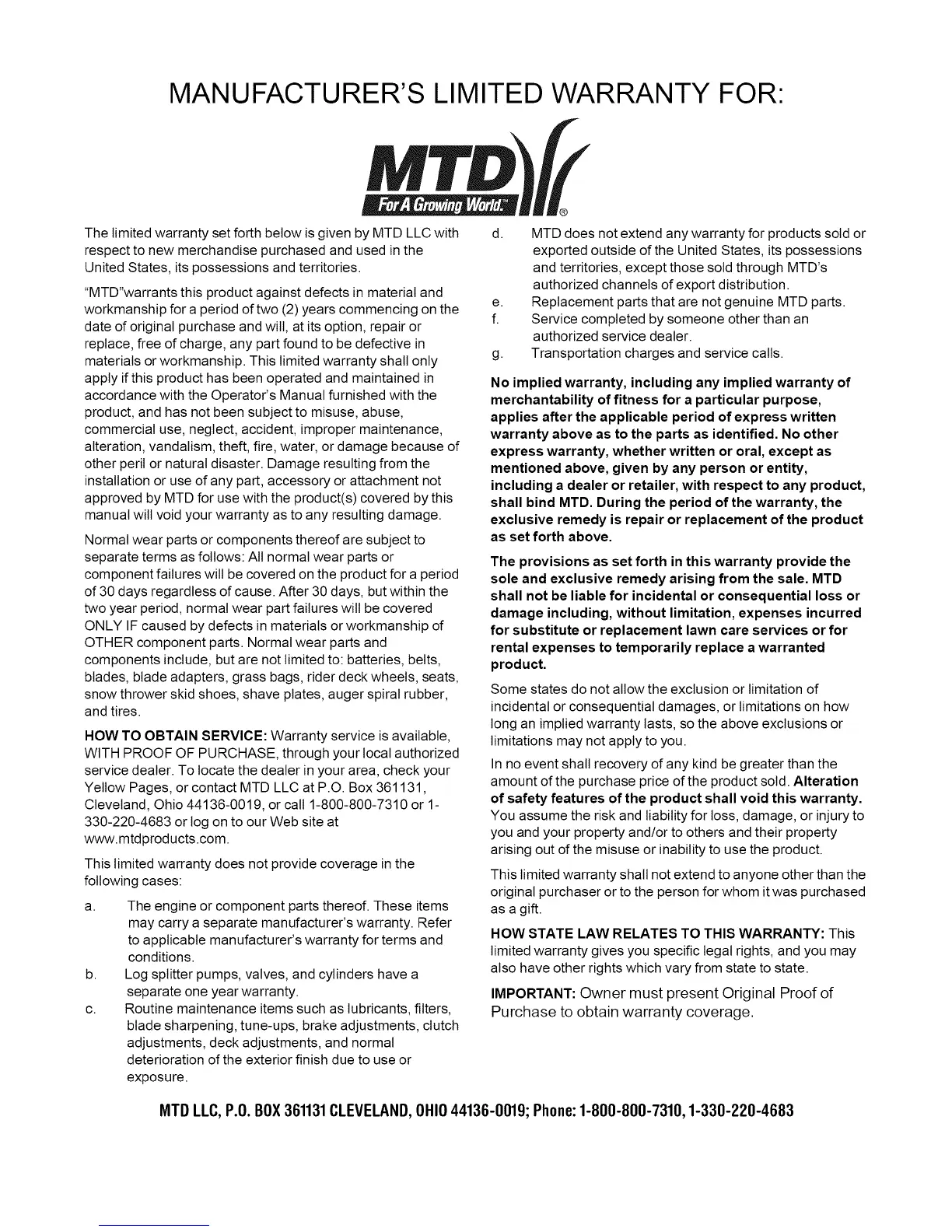MTD LLC, P.O.BOX361131CLEVELAND,OHIO44136-0019; Phone:1-800-800-7310,1-330-220-4683