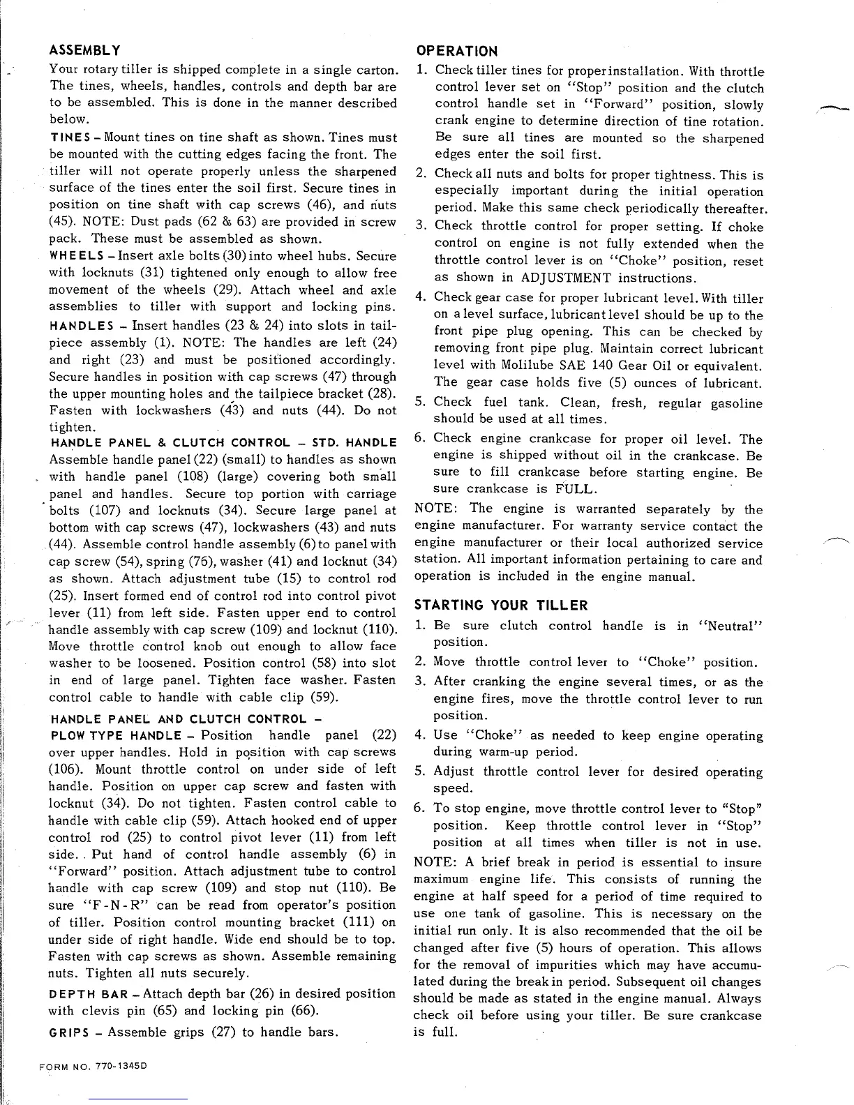 MTD 218-360 - Assembly; Operation; Starting Your Tiller; Tines
