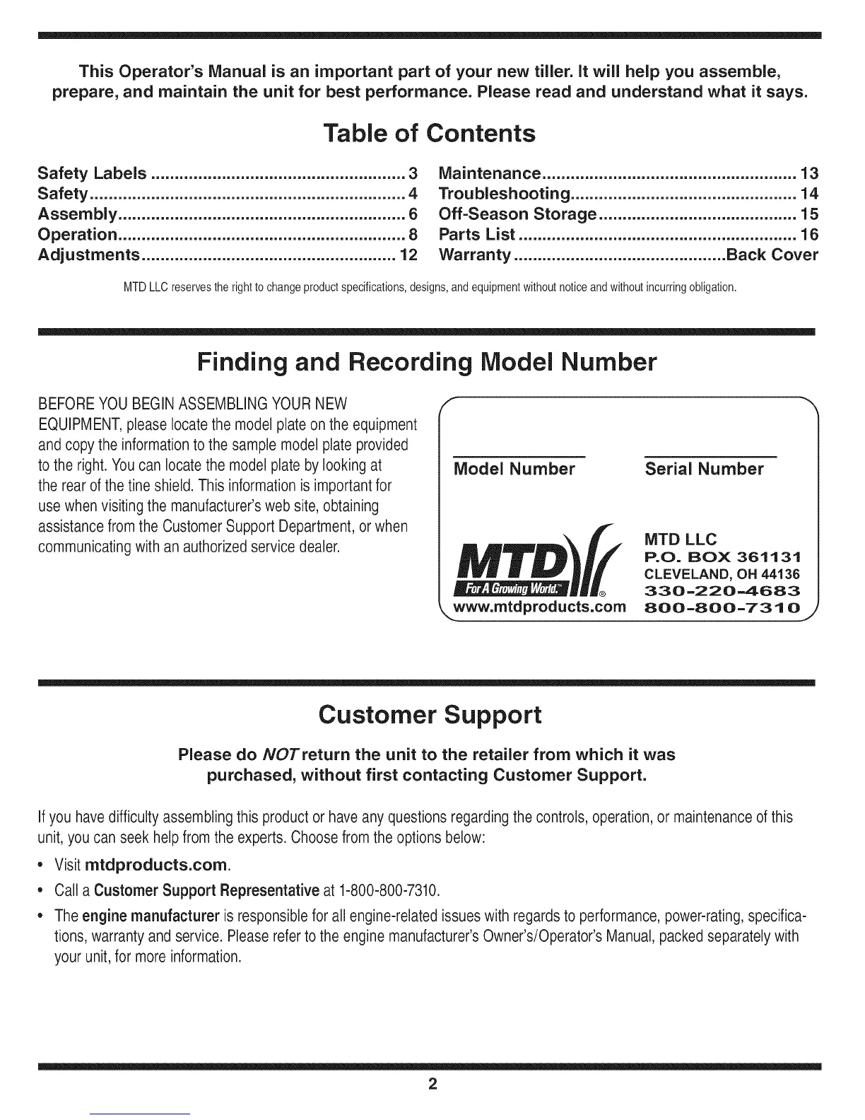 This Operator's Manual is an important part of your new tiller, it will help you assemble,