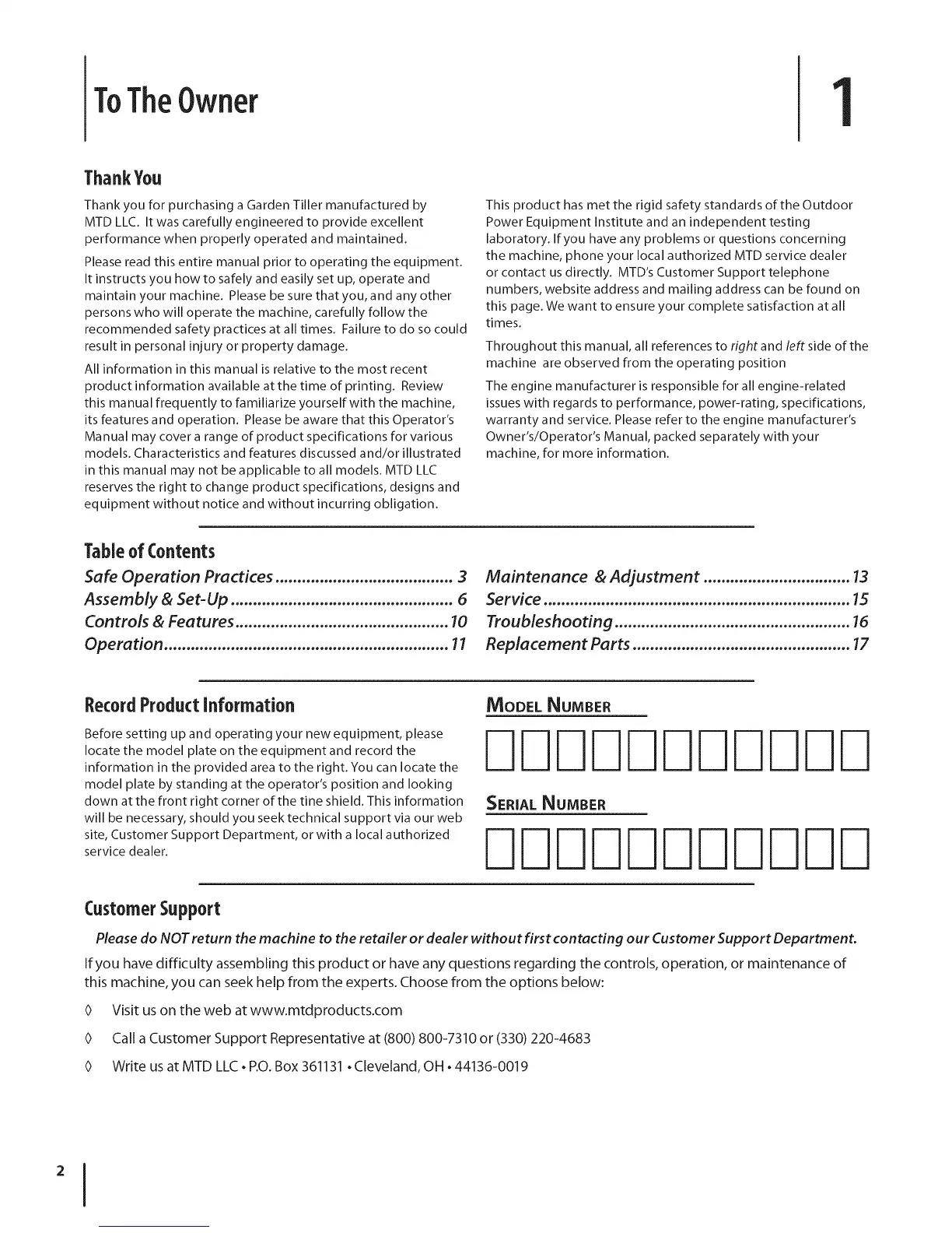 Write us at MTD LLC • P.O. Box 361131 • Cleveland, OH • 44136-0019