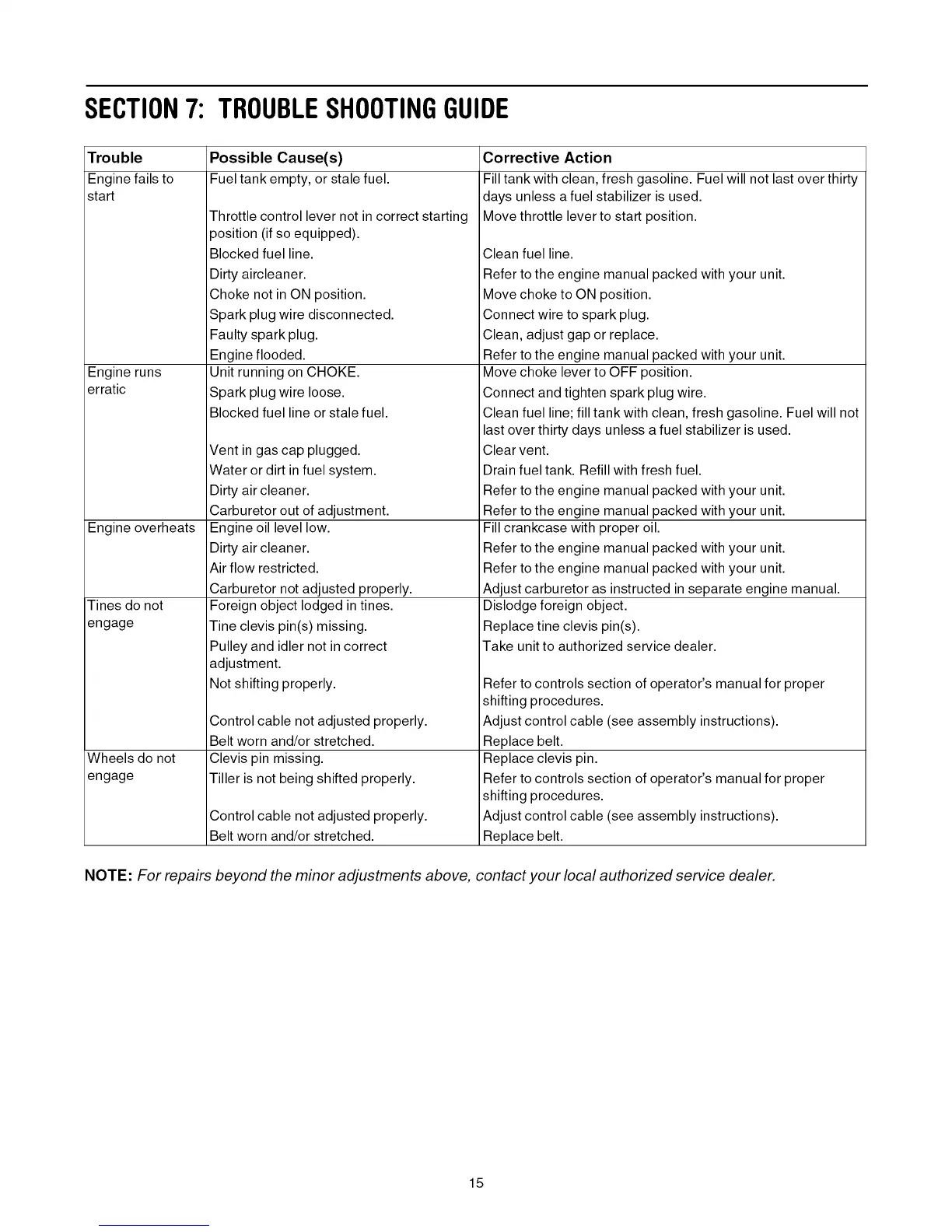 NOTE: For repairs beyond the minor adjustments above, contact your local authorized service dealer.
