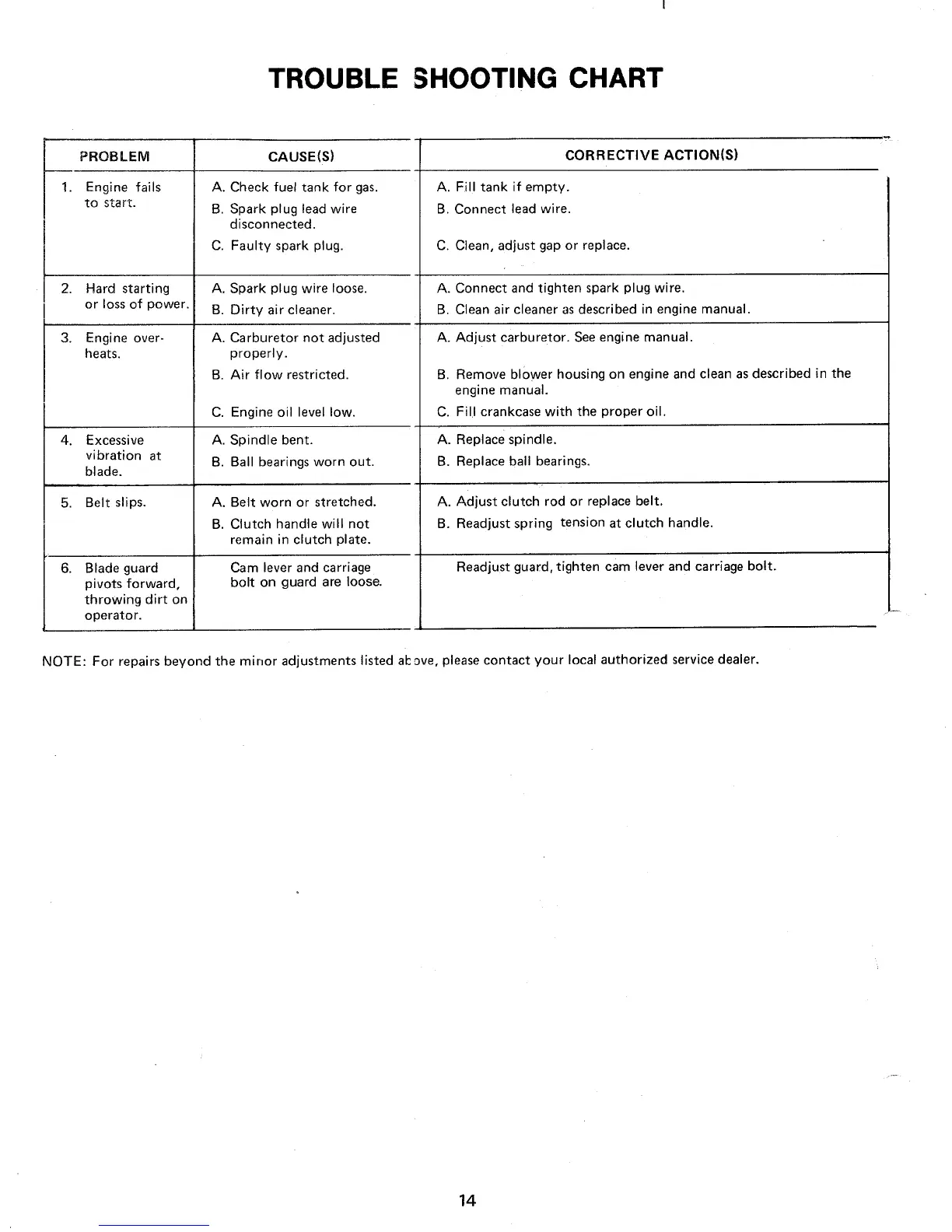 MTD 24604-9 - Trouble Shooting Chart; Engine Starting Issues; Performance Problems; Vibration and Belt Issues