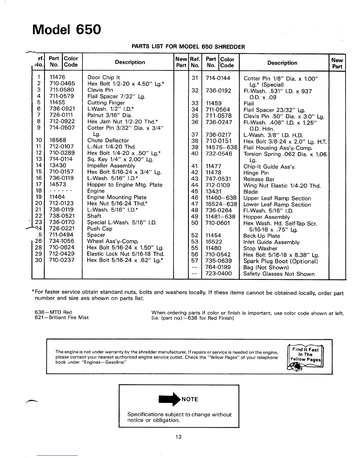 MTD 24650-8 - Parts List; Model 650 Parts Identification