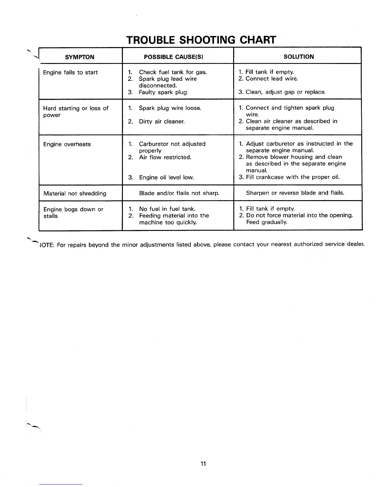 MTD 24650-9 - Troubleshooting; TROUBLE SHOOTING CHART