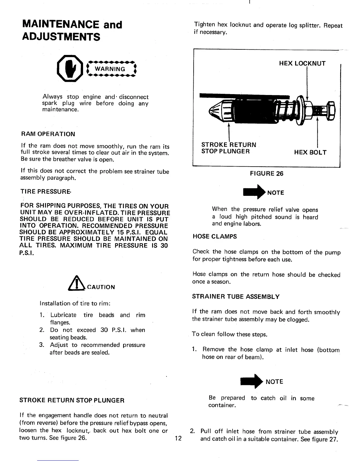 MTD 249-645A - MAINTENANCE AND ADJUSTMENTS; RAM AND TIRE MAINTENANCE; PLUNGER AND HOSE CLAMP CHECKS