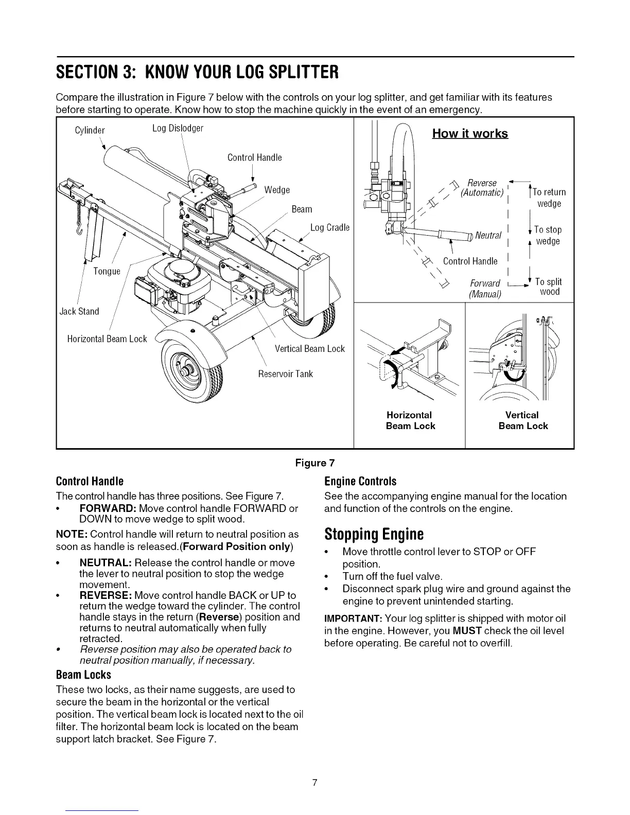 Compare the illustration in Figure 7 below with the controls on your log splitter, and get familiar with its features