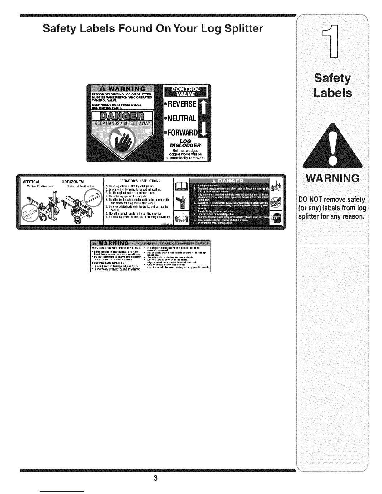 • Do not attempt to move log splitter . Attach safety ohains to tow vehiole,