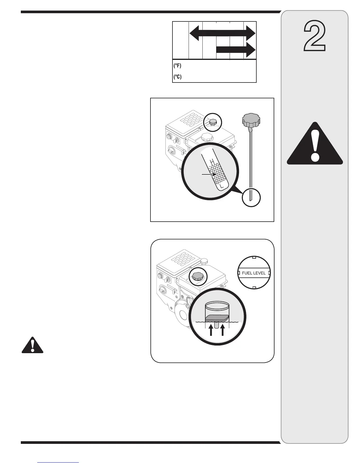 A fuel level indicator is located in the fuel tank. Fill 2.