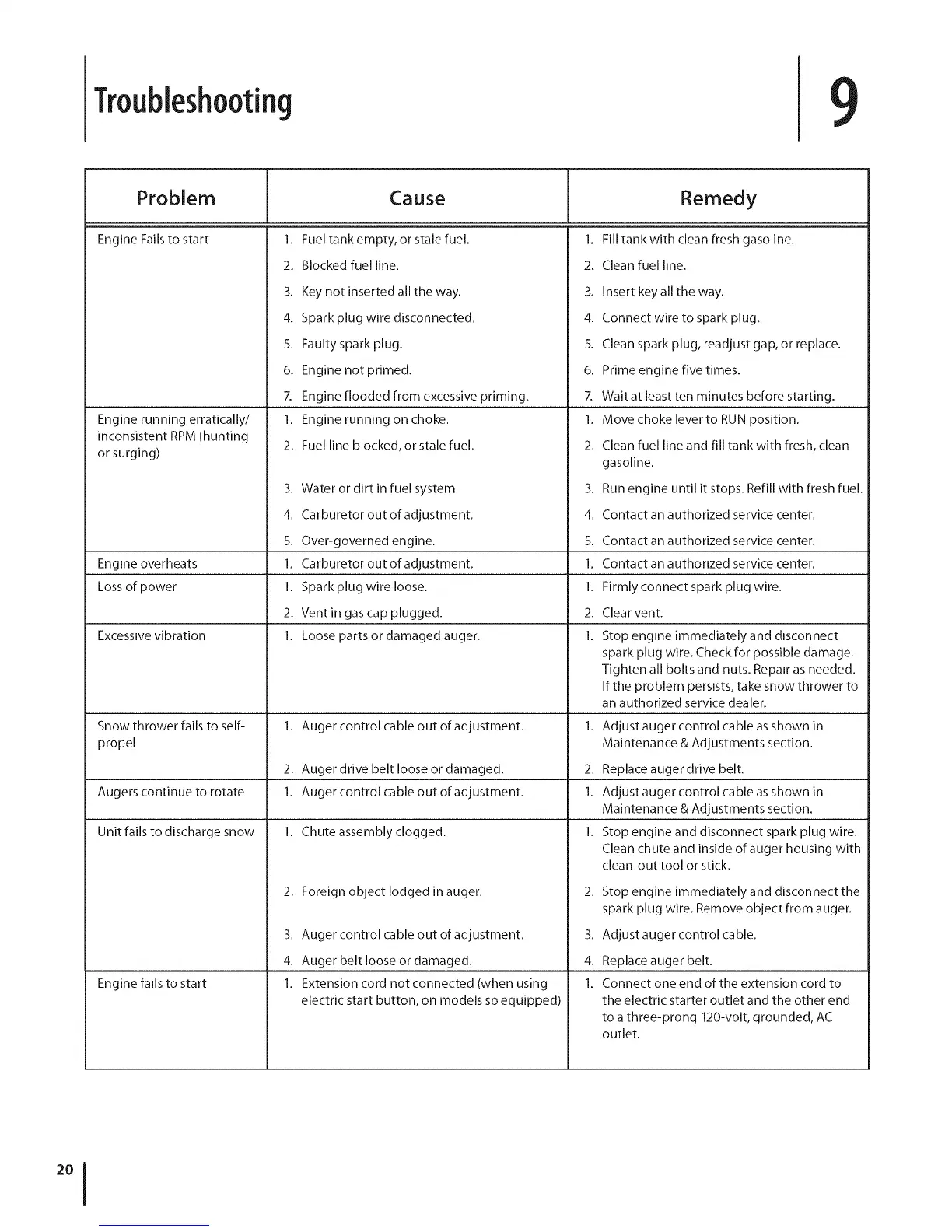 Unit fails to discharge snow 1. Chute assembly clogged. 1.