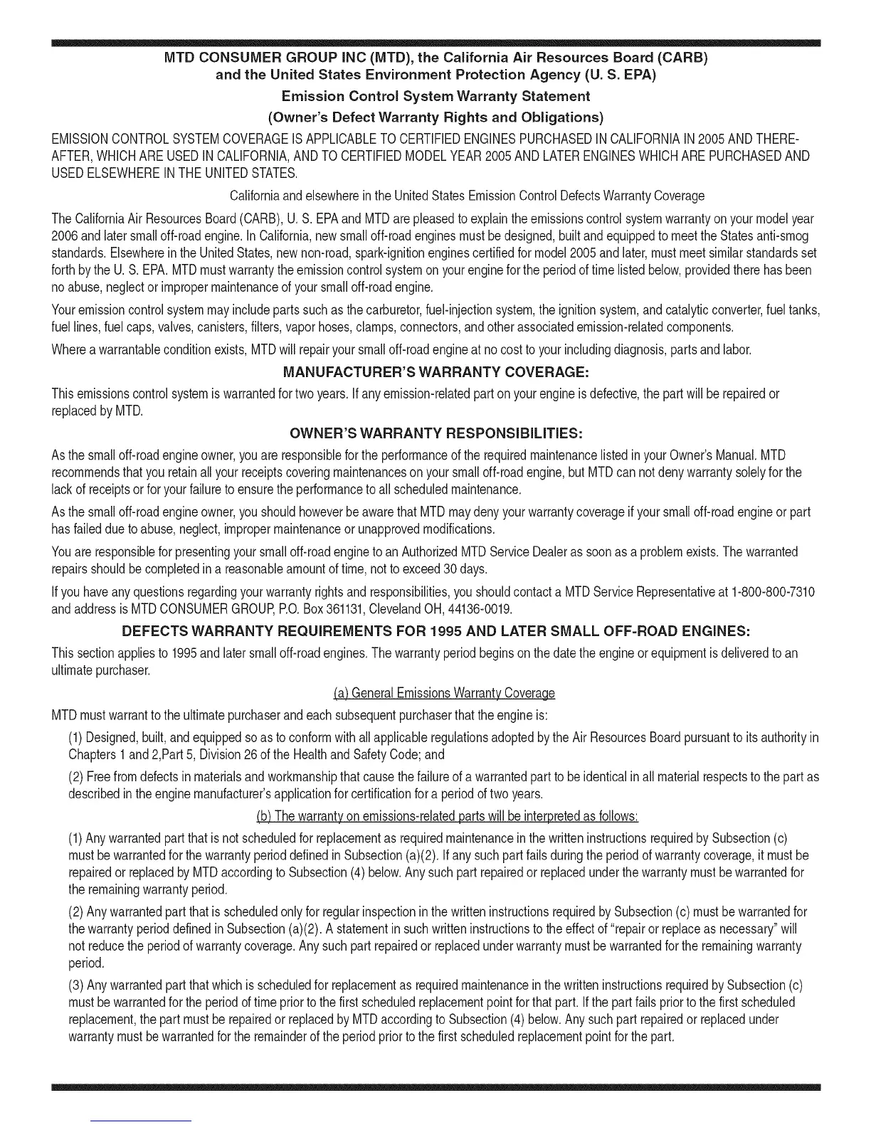 TheCaliforniaAir ResourcesBoard(CARB),U.S. EPAandMTDarepleasedto explaintheemissionscontrolsystemwarrantyonyour modelyear