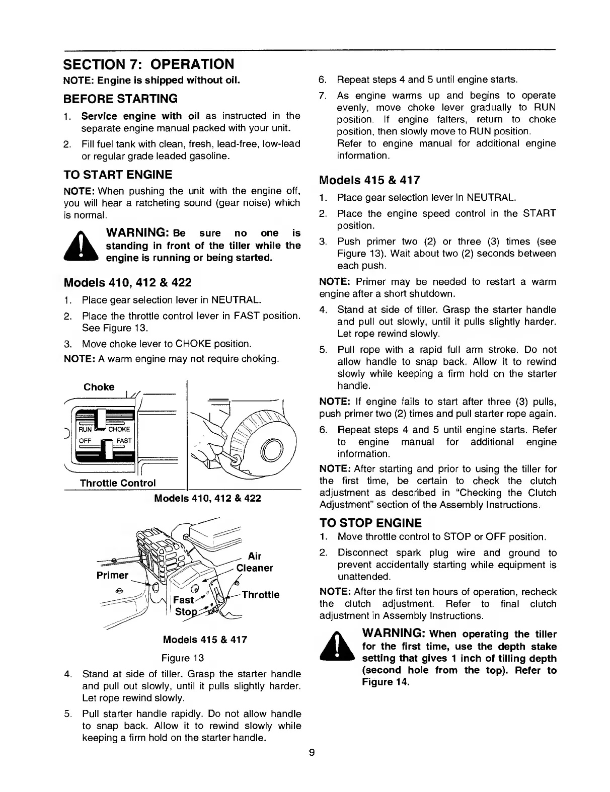 MTD 410 - Tiller Operation Procedures; Pre-Start and Starting Procedures; Engine Starting and Stopping