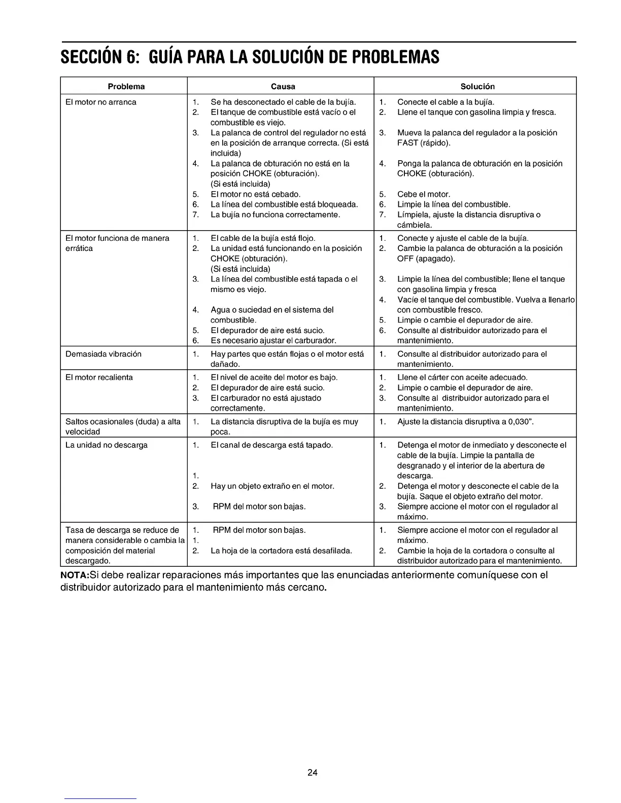 NOTA:Si debe realizar reparaciones mas importantes que las enunciadas anteriormente comunfquese con el