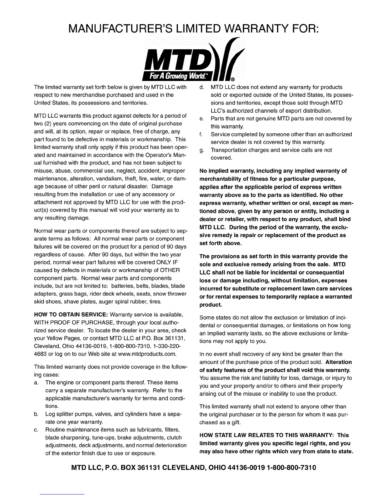 MTD LLC, P.O. BOX 361131 CLEVELAND, OHIO 44136-0019 1-800-800-7310