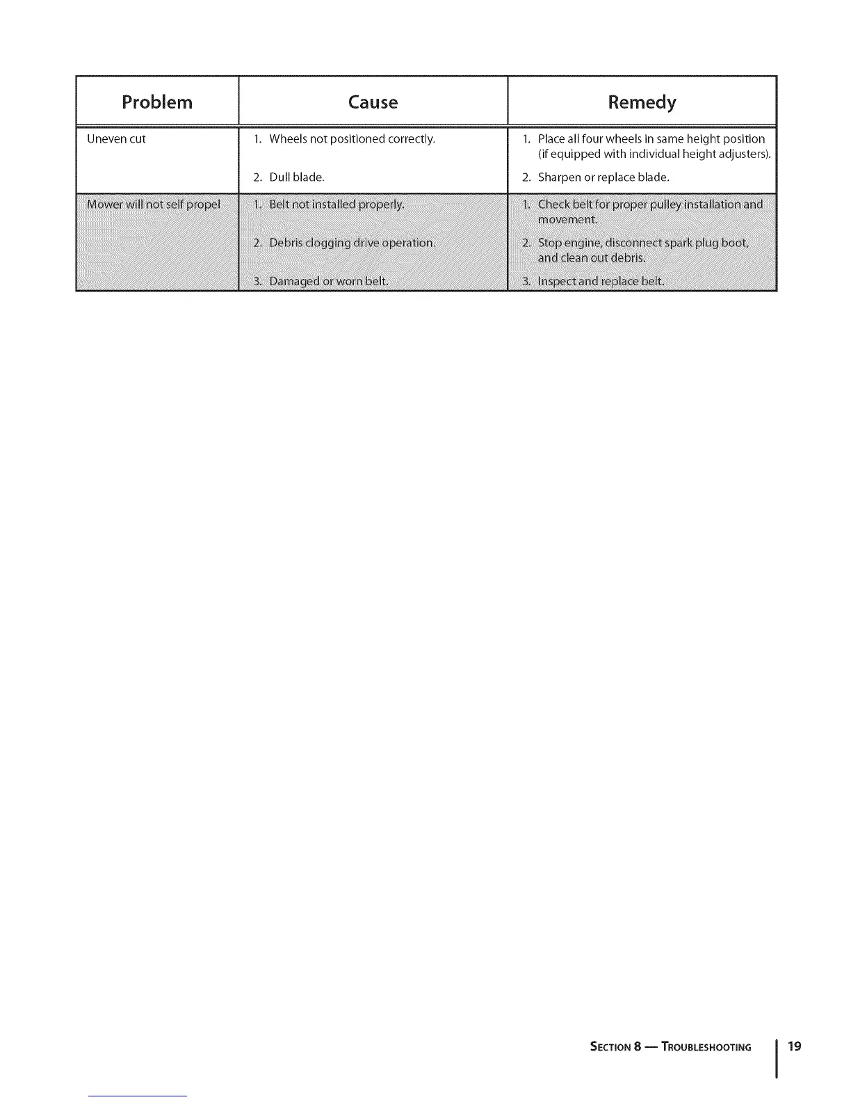 Uneven cut 1. Wheels not positioned correctly. 1. Place all four wheels in same height position