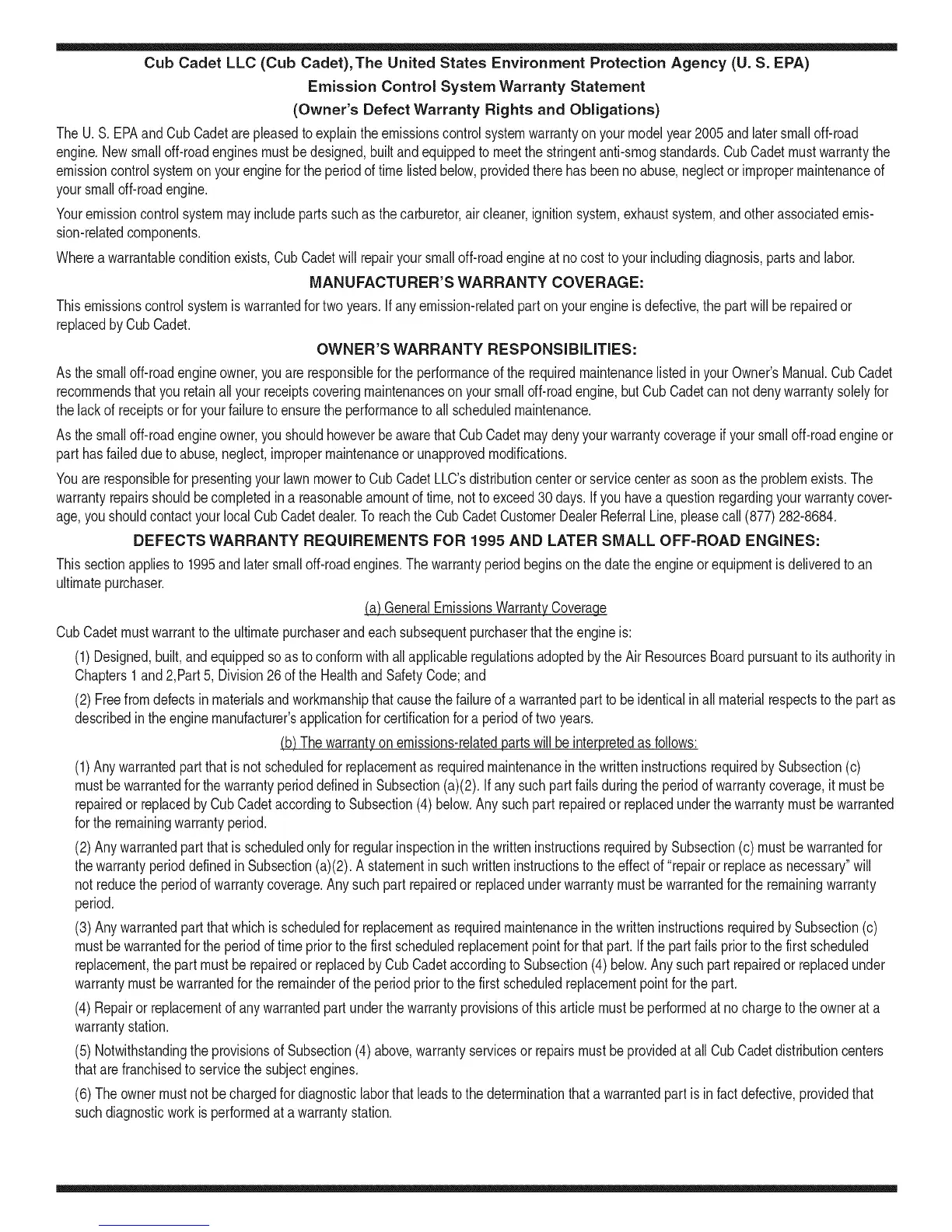 engine.Newsmalloff-roadenginesmustbedesigned,builtandequippedto meetthe stringentanti-smogstandards.CubCadetmustwarrantythe