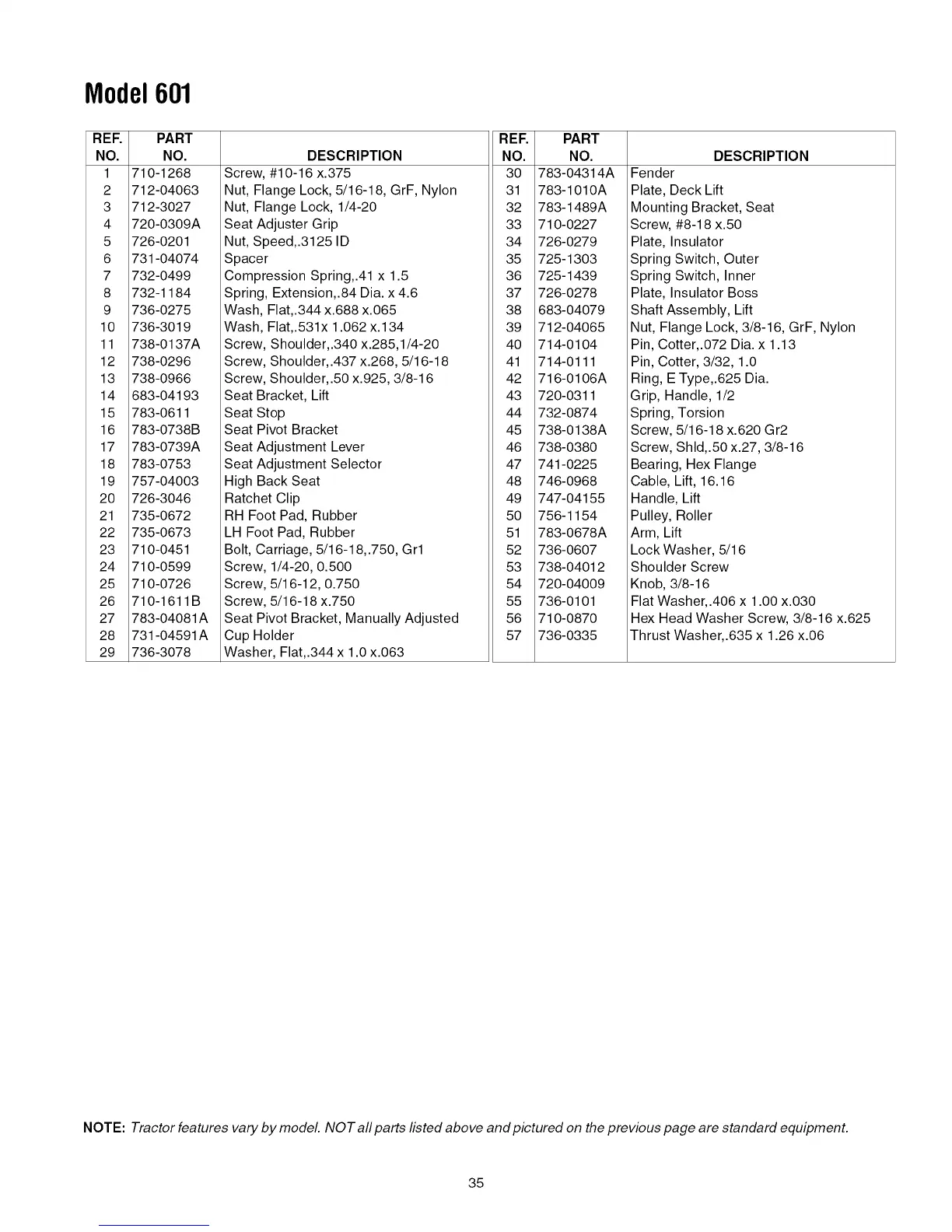 NOTE: Tractor features vary by model NOT all parts listed above and pictured on the previous page are standard equipment.