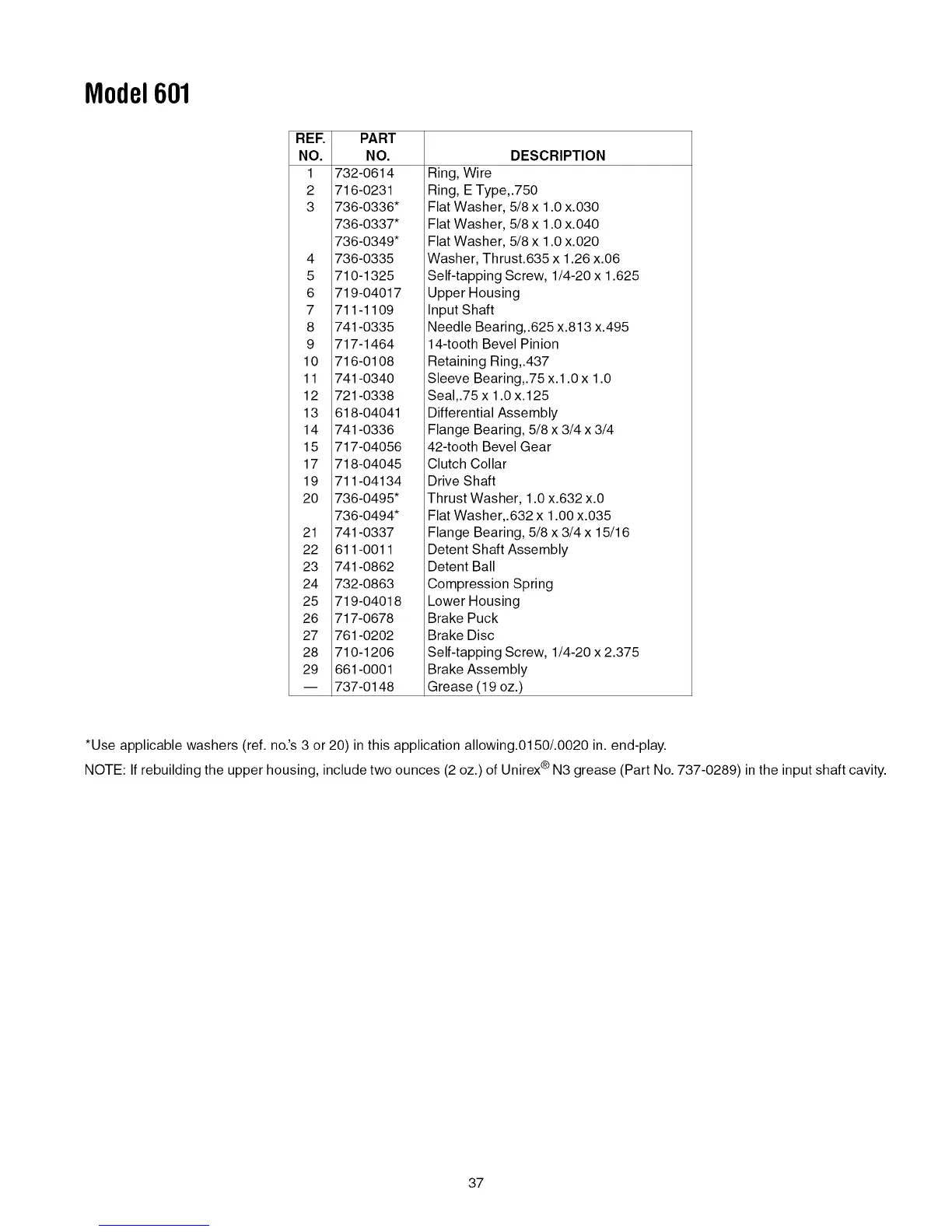 NOTE: If rebuilding the upper housing, include two ounces (2 oz.) of Unirex ® N3 grease (Part No. 737-0289) in the input shaft cavity.