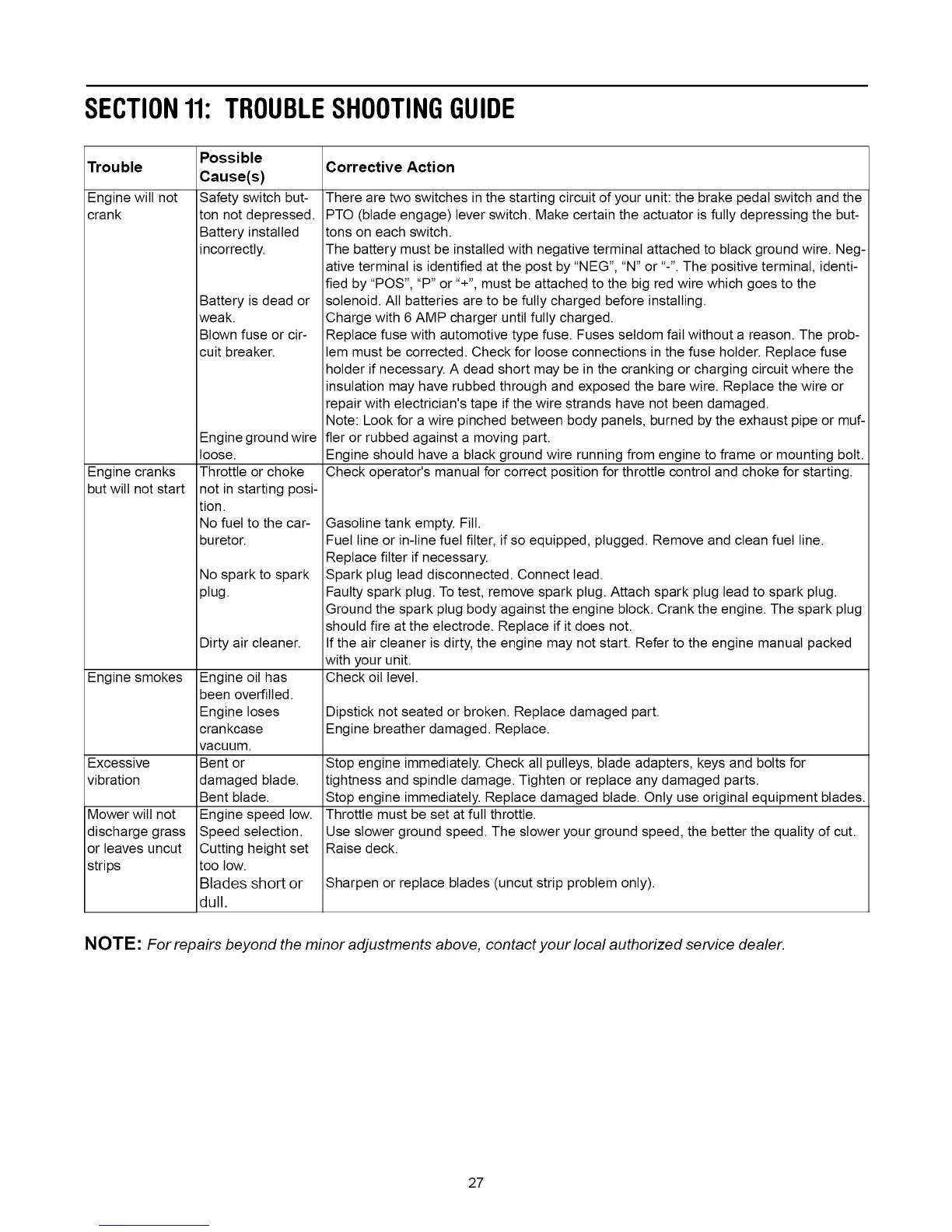 NOTE: For repairs beyond the minor adjustments above, contact your local authorized service dealer.