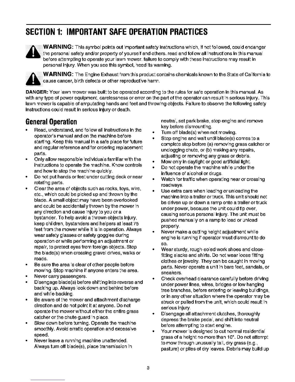 DANGER: Your lawn mower was built to be operated according to the rules for safe operation in this manual. As
