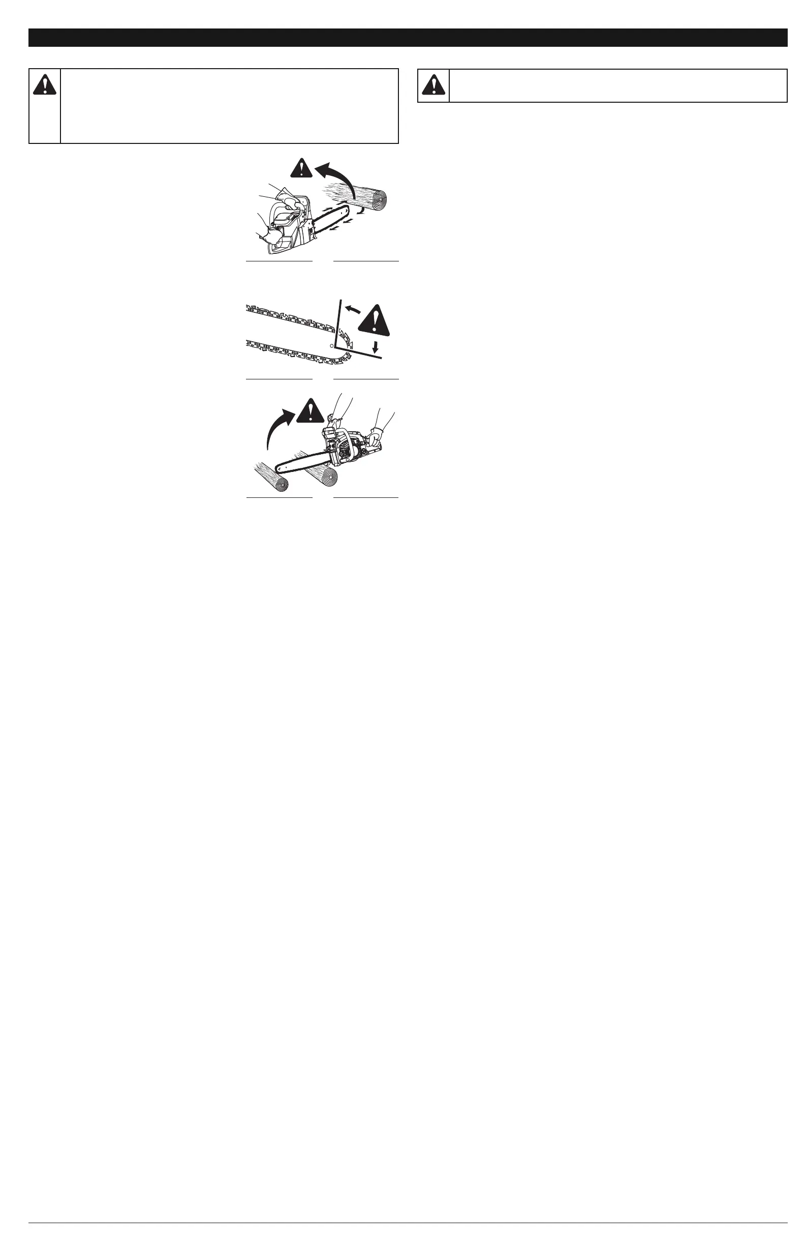 • Never start the saw when the guide bar is inside an existing cut. Be extremely careful when re-entering