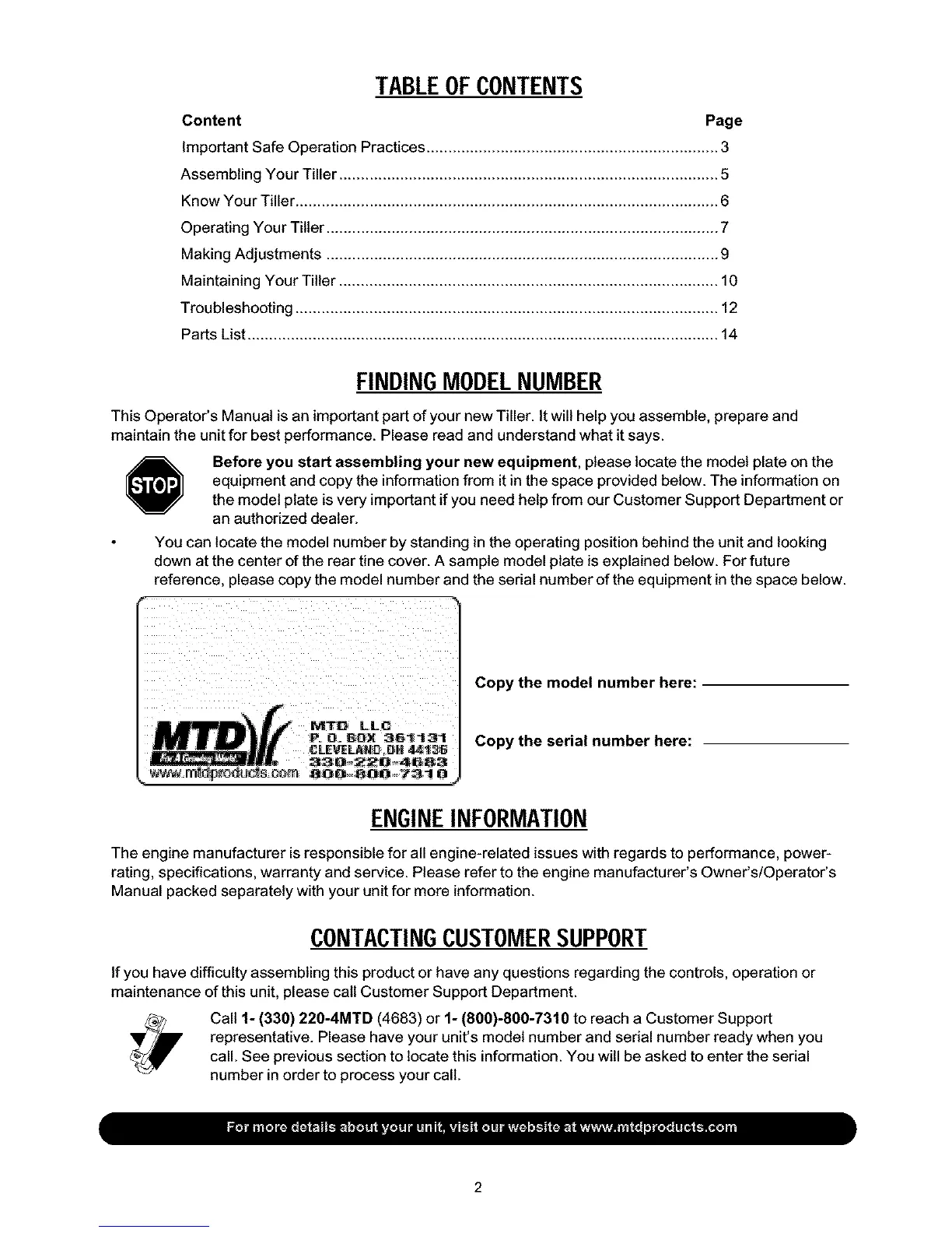 Call 1- (330) 220-4MTD (4683) or 1- (800)-800-7310 to reach a Customer Support