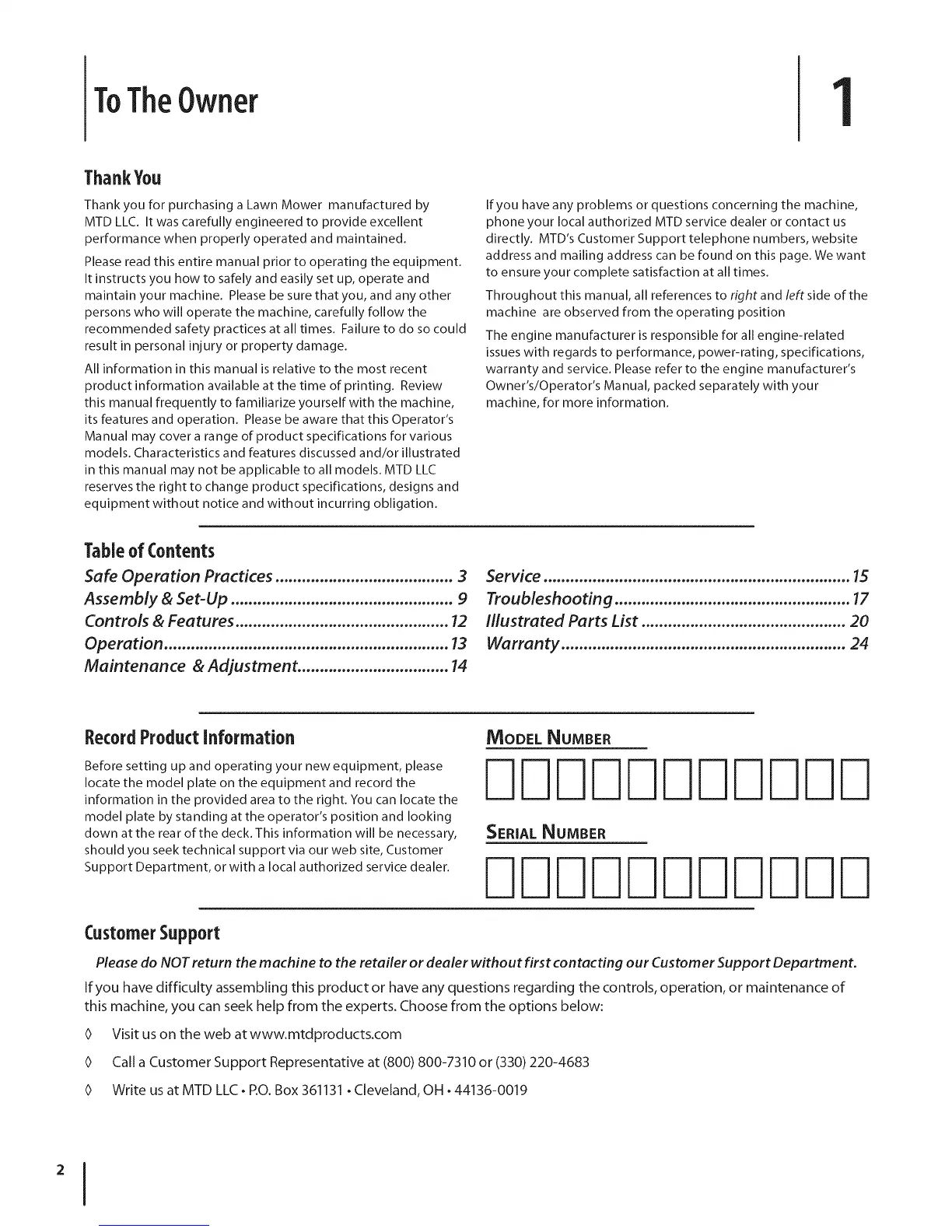 Please do NOT return the machine to the retailer or dealer without first contacting our Customer Support Department.
