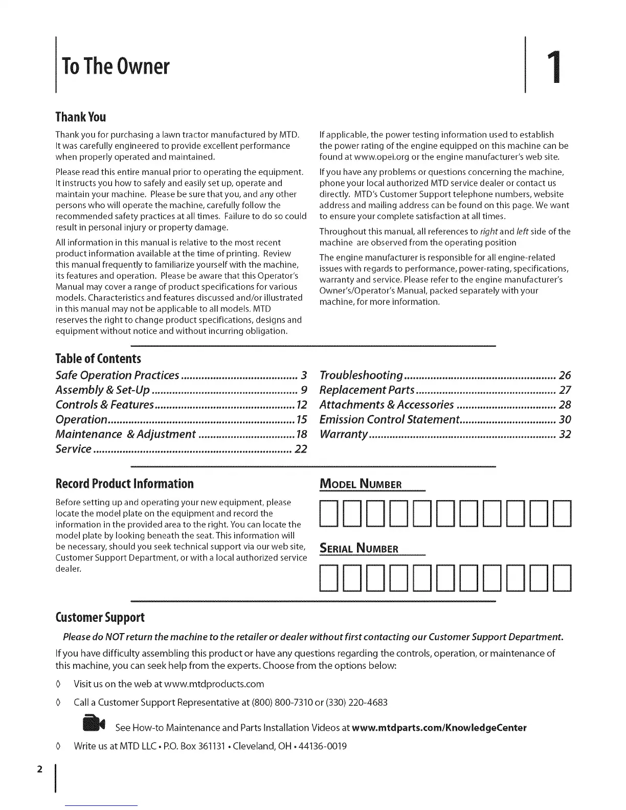Thank you for purchasing a lawn tractor manufactured by MTD.