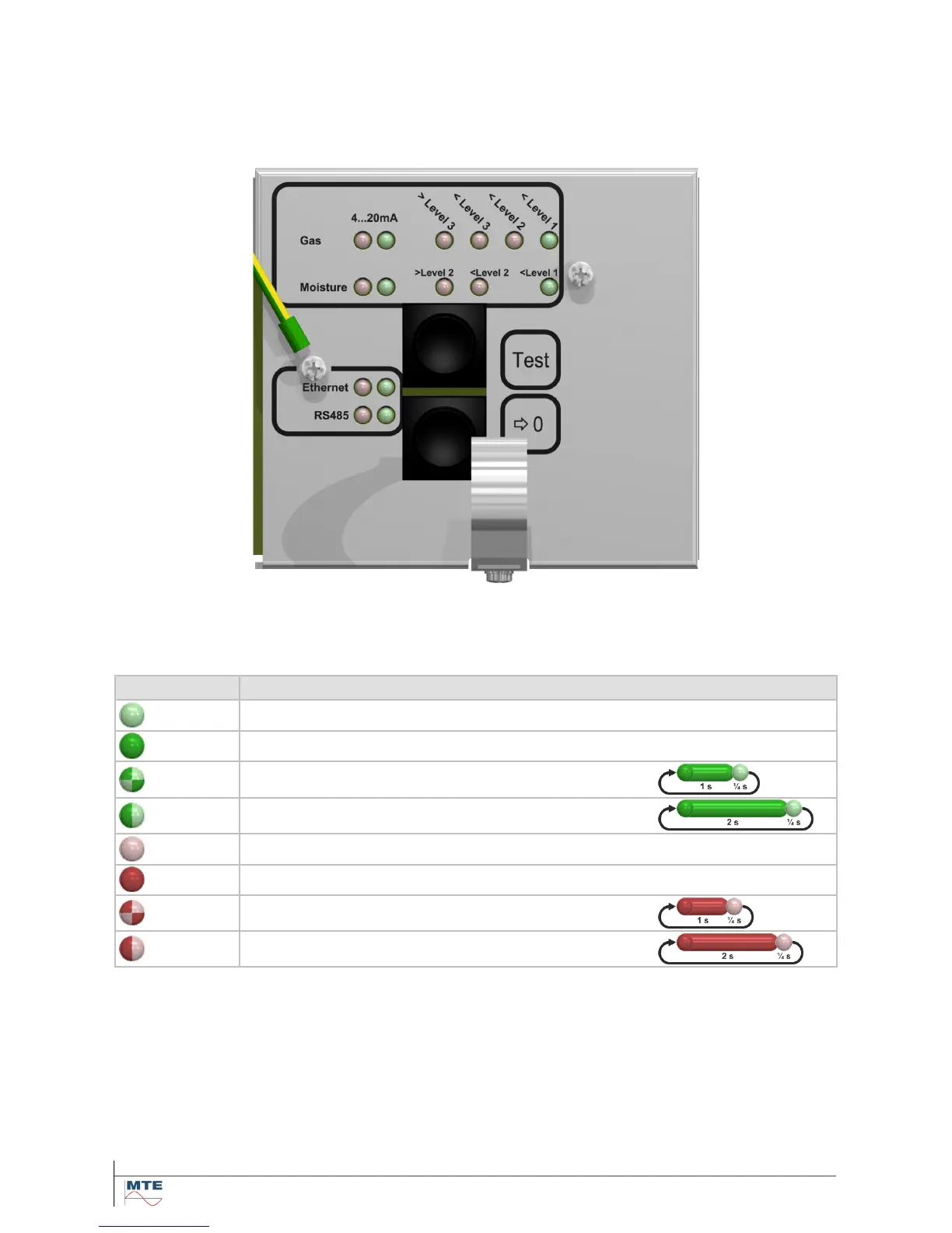 The icons of the single color LEDs (green or red) have the following signification: