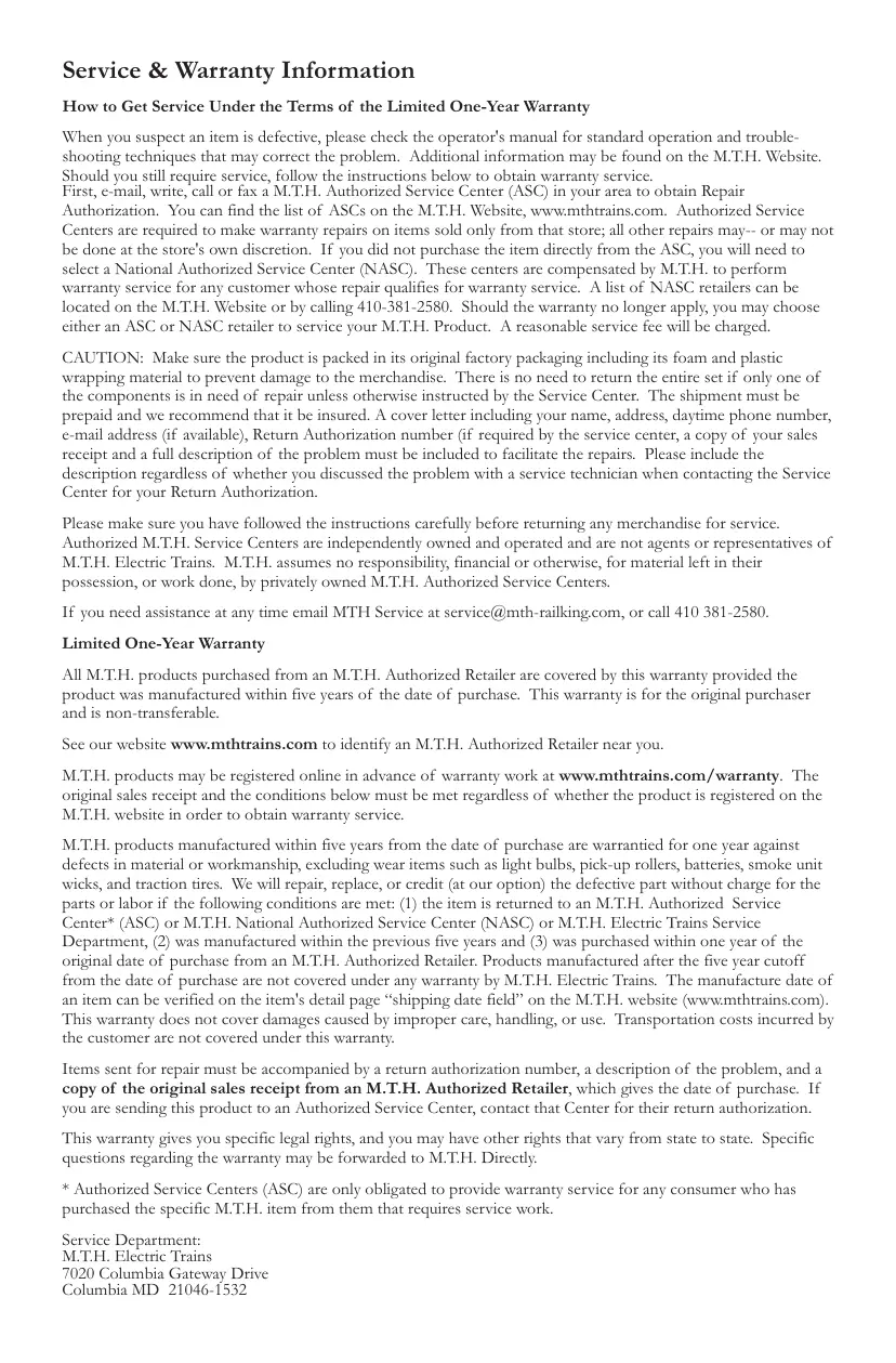either an ASC or NASC retailer to service your M.T.H. Product. A reasonable service fee will be charged.