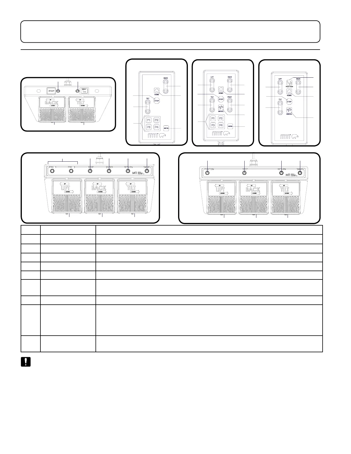 7 Return Button Returns the chair to the home position (Lift Down, Tilt Down, and Back Up)