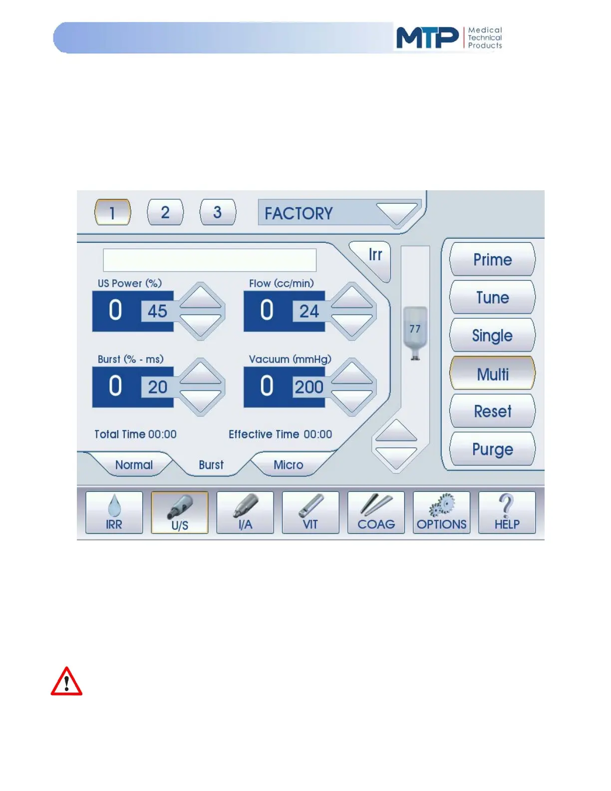 The Burst Mode may be selected for Single or Multi-burst functions at the “FIXED” U/S Power %