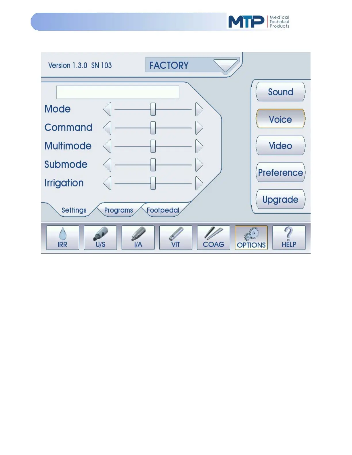 Irrigation: Controls the voice volume for the Irrigation (IRR) soft-key just below the