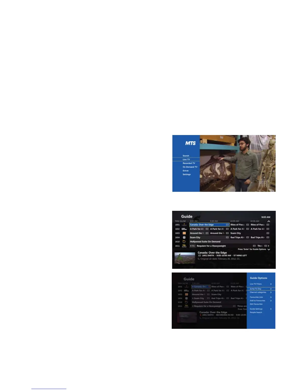When in the MENU, GUIDE, MTS Video on Demand, or Recorded TV screens: